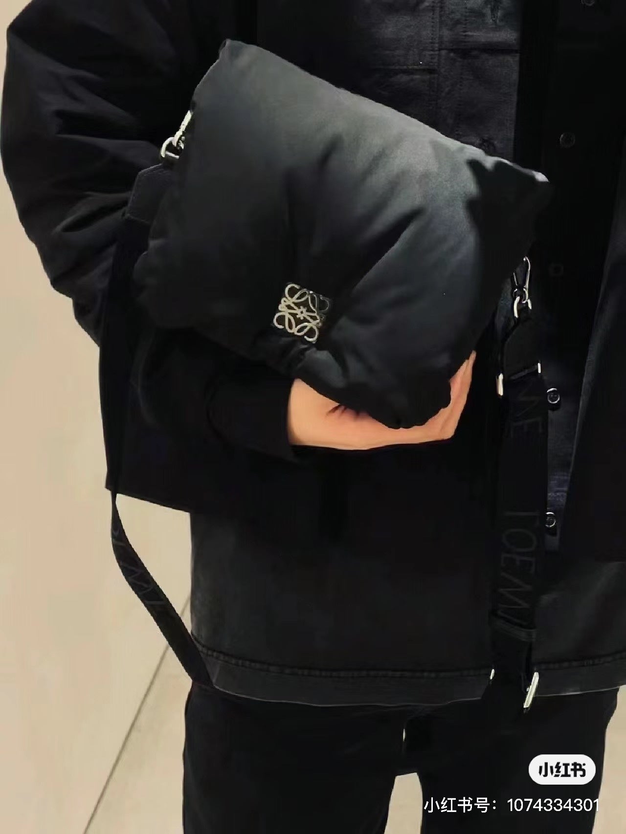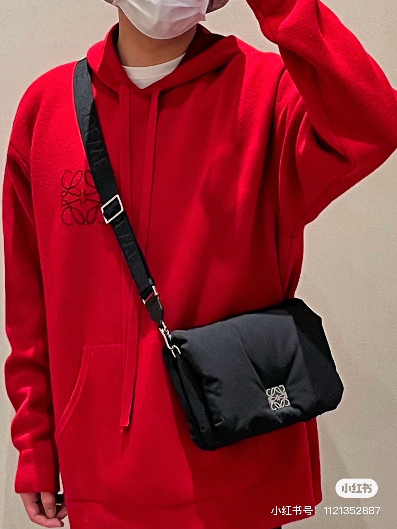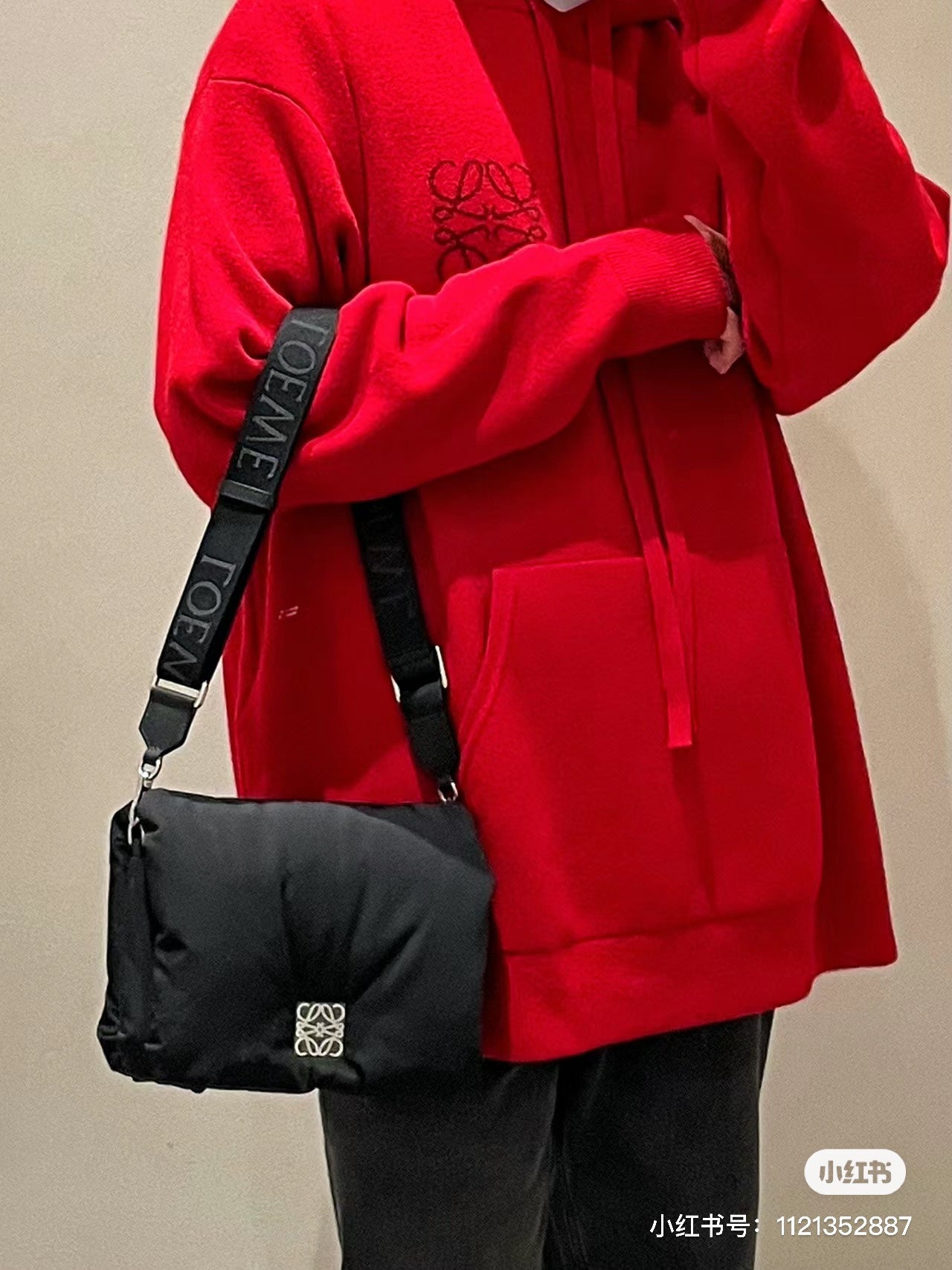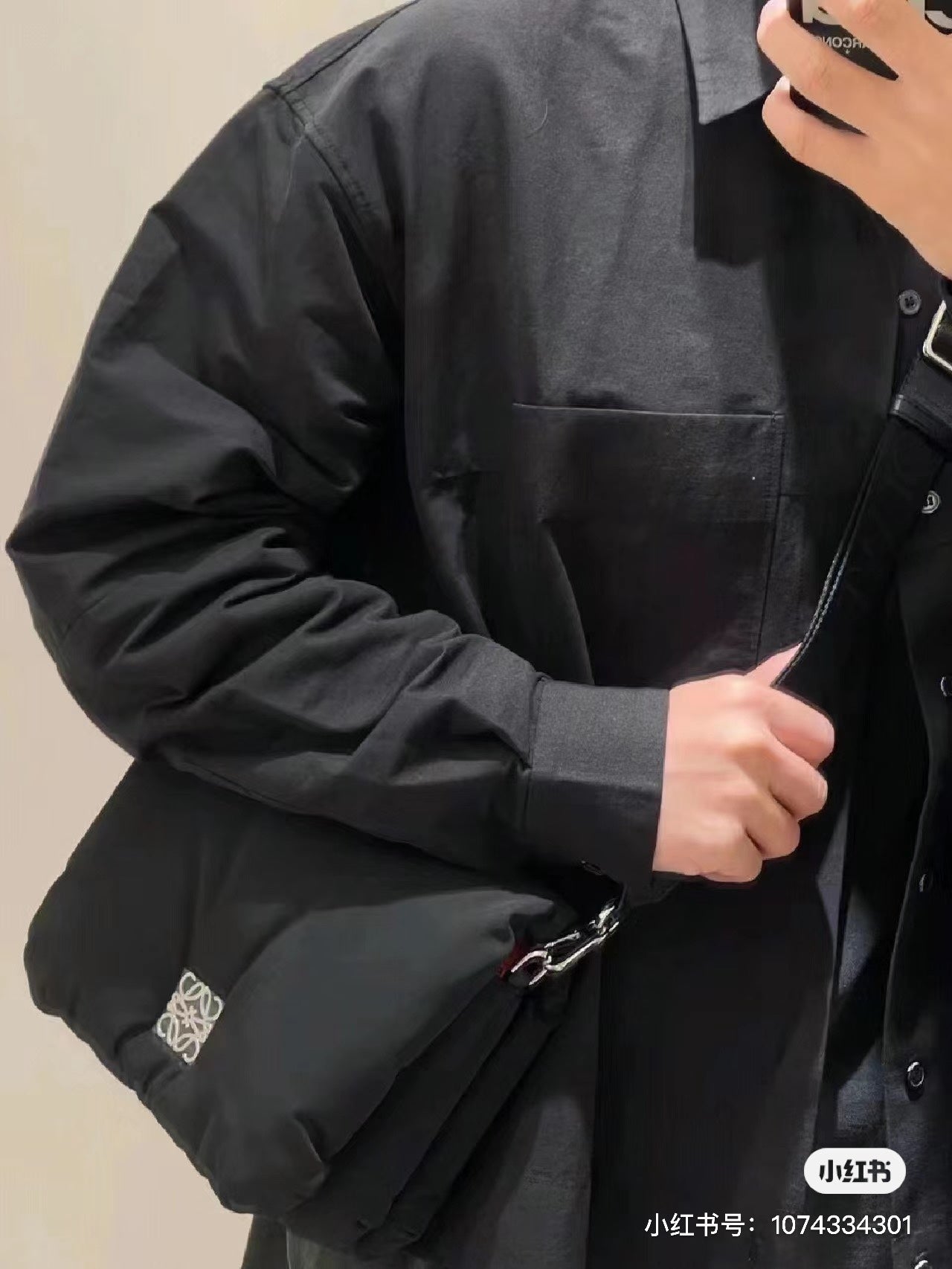 Introducing the Nylon Puffer Goya Bag, a sophisticated accessory inspired by the iconic aesthetics of Goya. Measuring 24 x 17 x 9 cm, this innovative bag features a luxurious goose feather backing for an enhanced sensory experience. Crafted from durable nylon, it comes equipped with removable and adjustable shoulder straps adorned with LOEWE jacquard for versatile styling.
