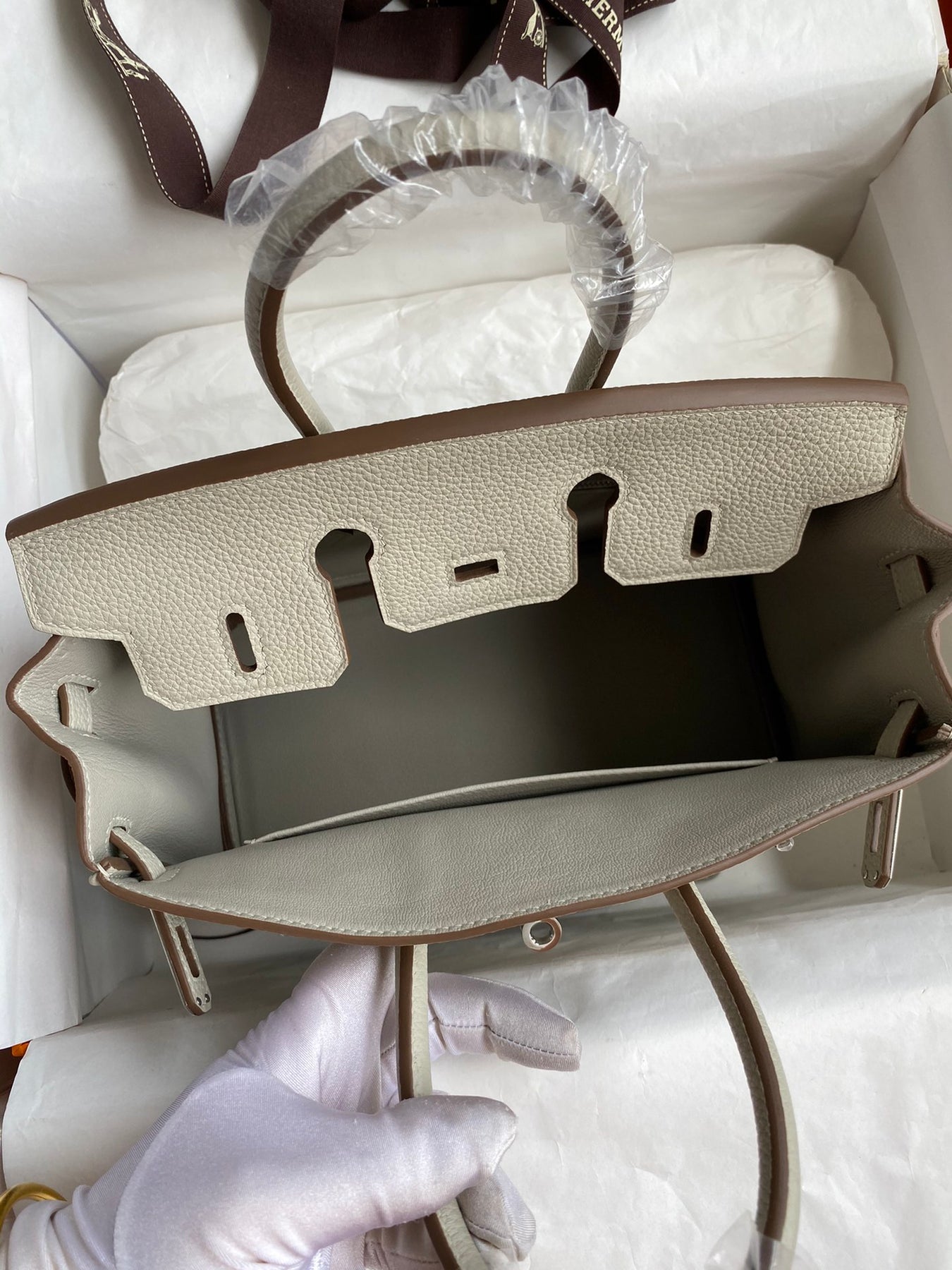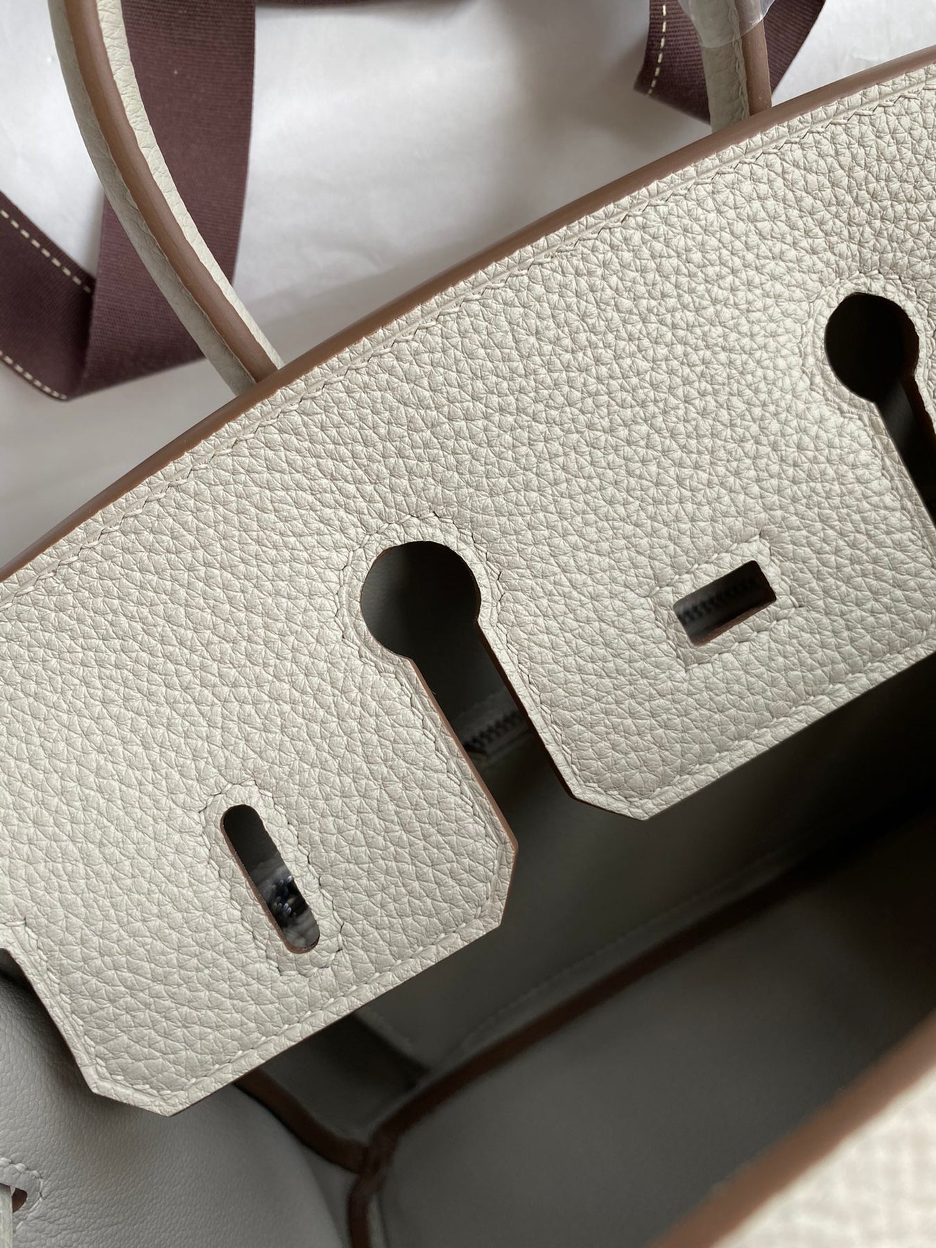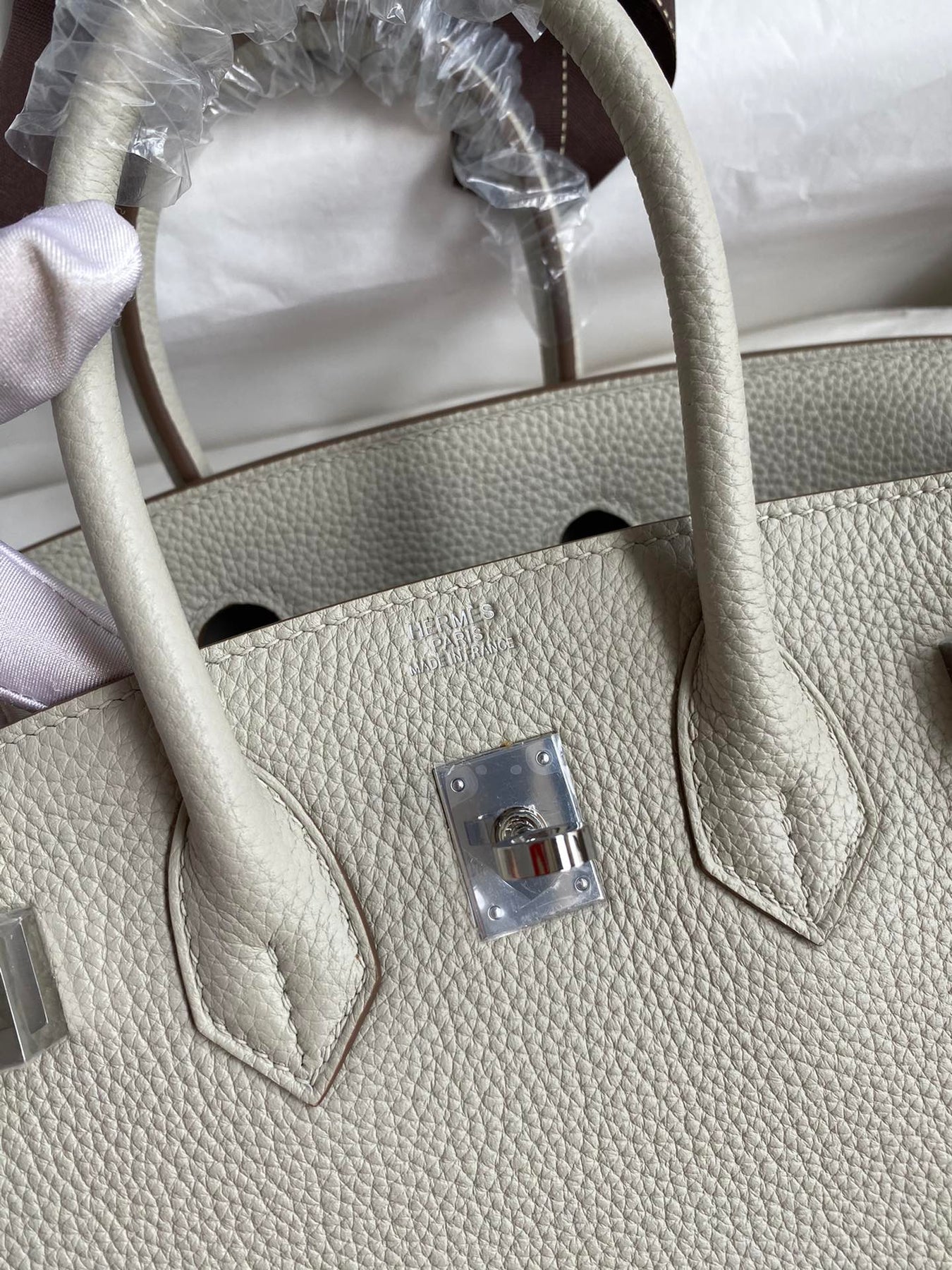 Discover the exquisite craftsmanship of our 25cm Birkin bag, featuring a semi-handmade beeswax stitching design. Made from luxurious imported Togo leather, this elegant accessory is presented in a sophisticated pearl gray shade and adorned with a sleek silver buckle. Perfect for elevating your style while ensuring durability and timeless appeal. Embrace luxury and functionality with this iconic piece.
