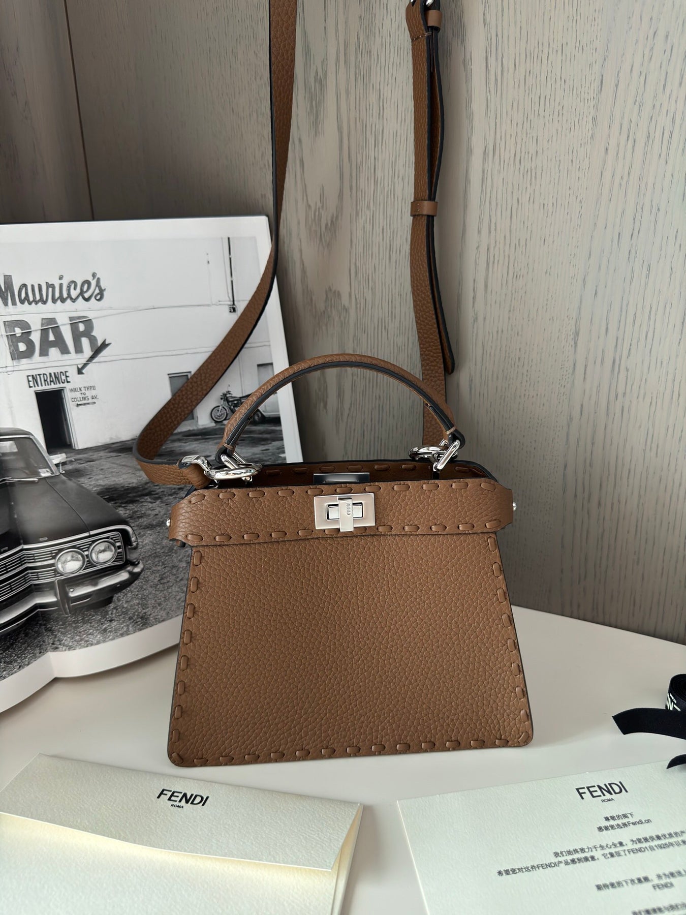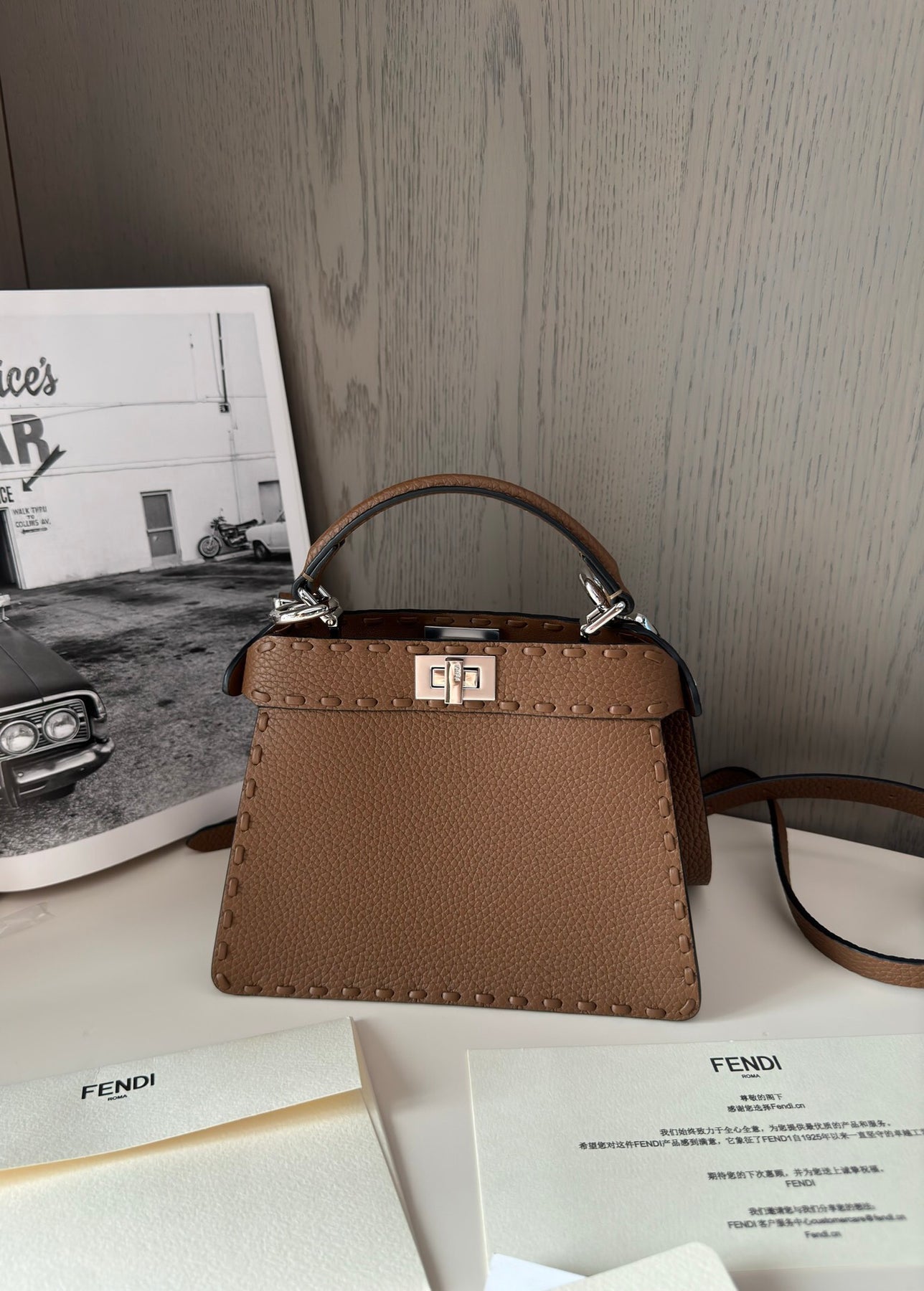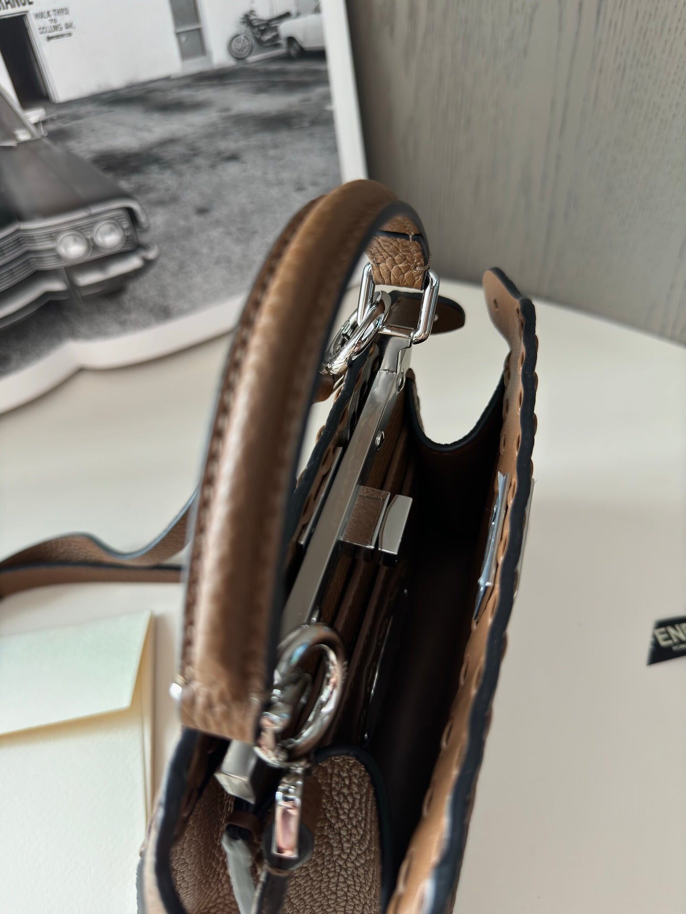 Introducing the Peekaboo ISeeU Petite Brown, a luxurious handbag crafted from Italian imported pebbled cowhide. This exquisite piece boasts a supple touch and showcases artisanal craftsmanship through its purely handmade detailing. With its elegant 20cm design, this bag effortlessly combines style and sophistication, making it the perfect accessory for any occasion. Elevate your fashion game with this high-end essential that exudes both versatility and charm.