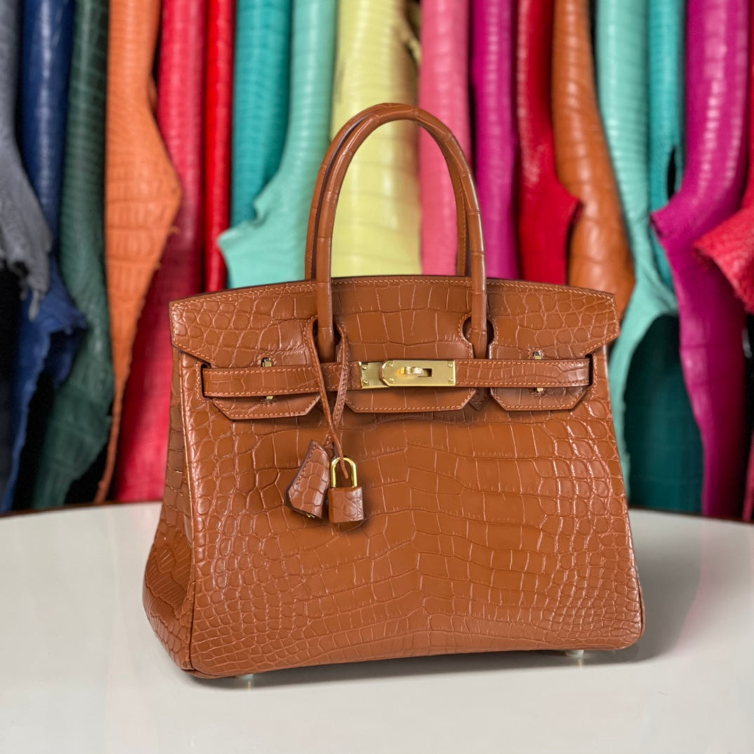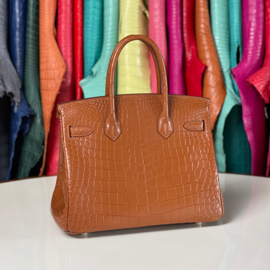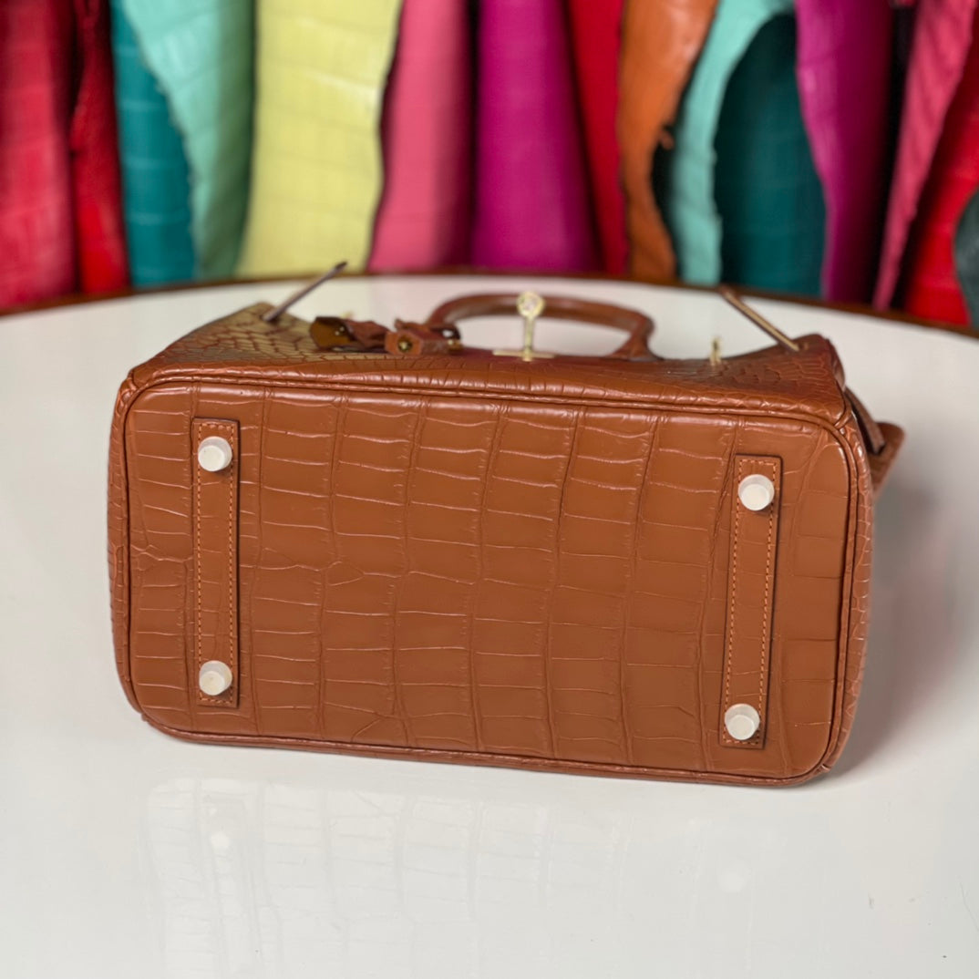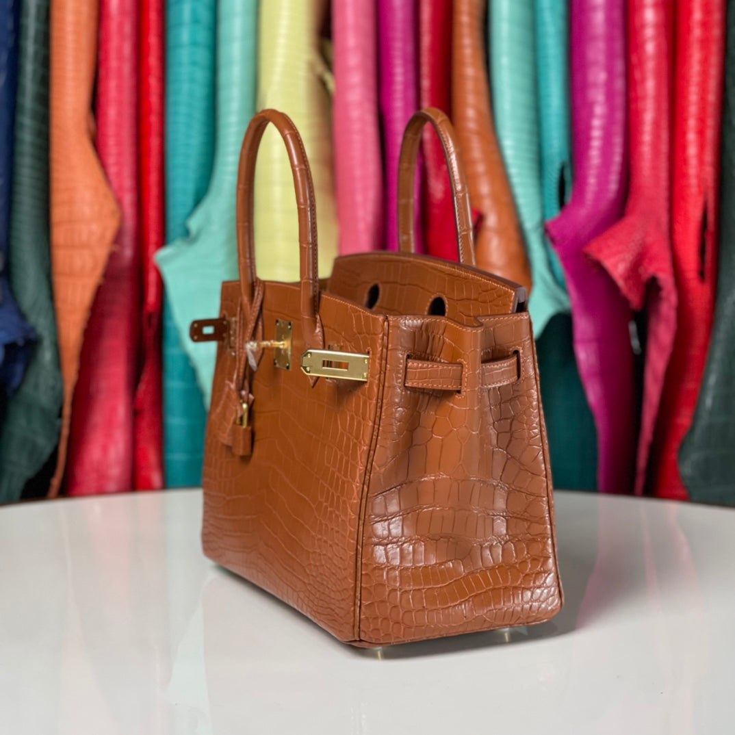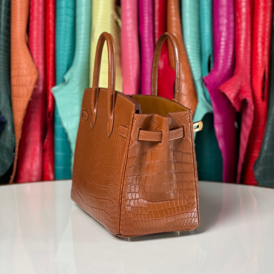 Introducing the Platinum 30—a luxurious handbag crafted with meticulous hand sewing techniques and adorned with high-quality stainless steel hardware. The elegant golden brown exterior is complemented by a stunning gold buckle, making this bag a timeless accessory for any occasion. Elevate your style with the perfect blend of craftsmanship and sophistication. Perfect for those who appreciate beauty and durability in their purses.