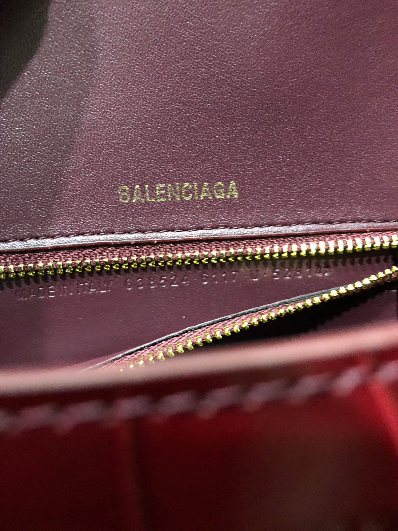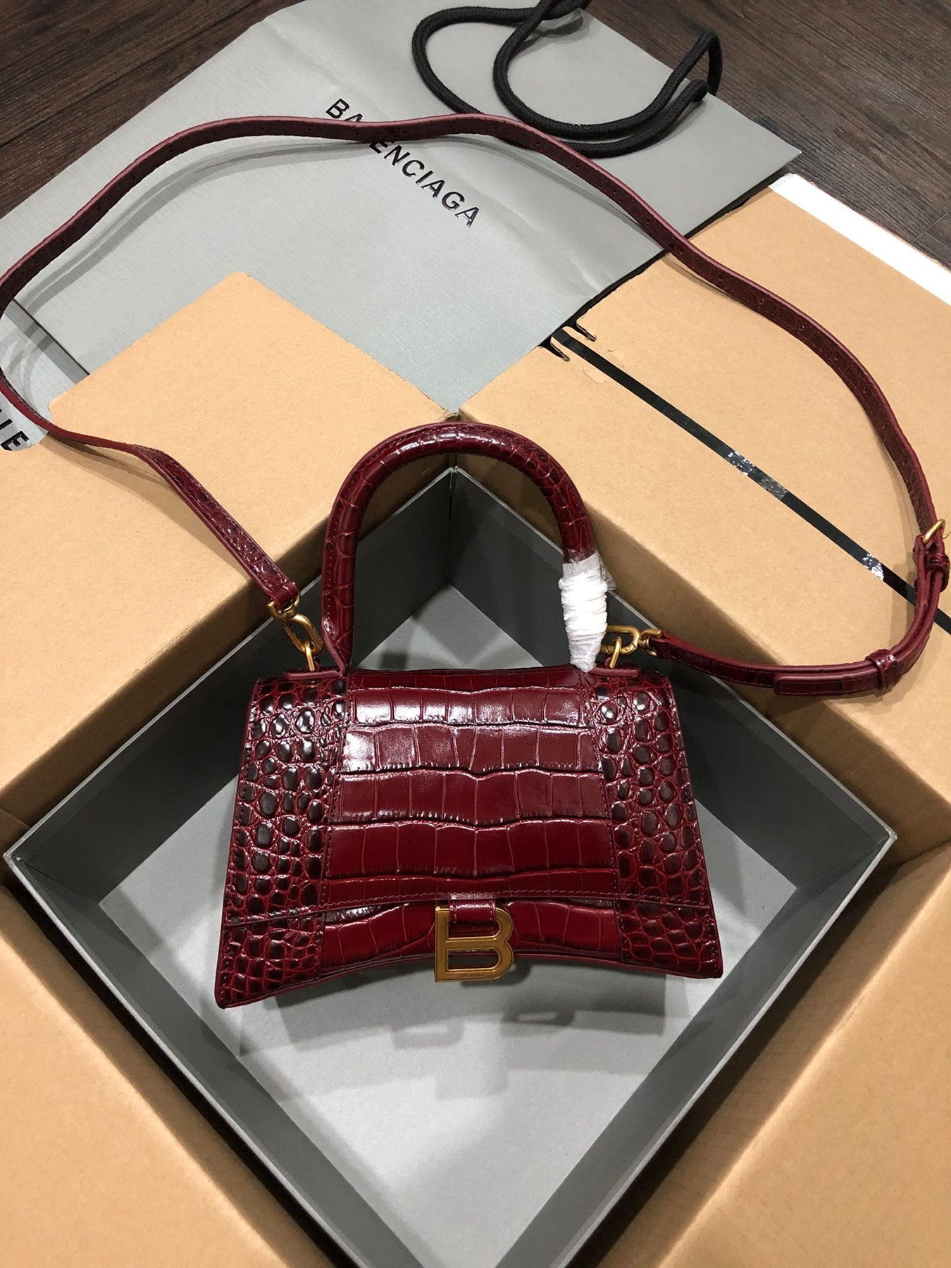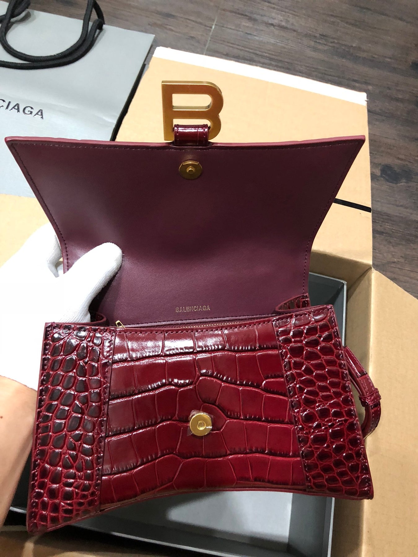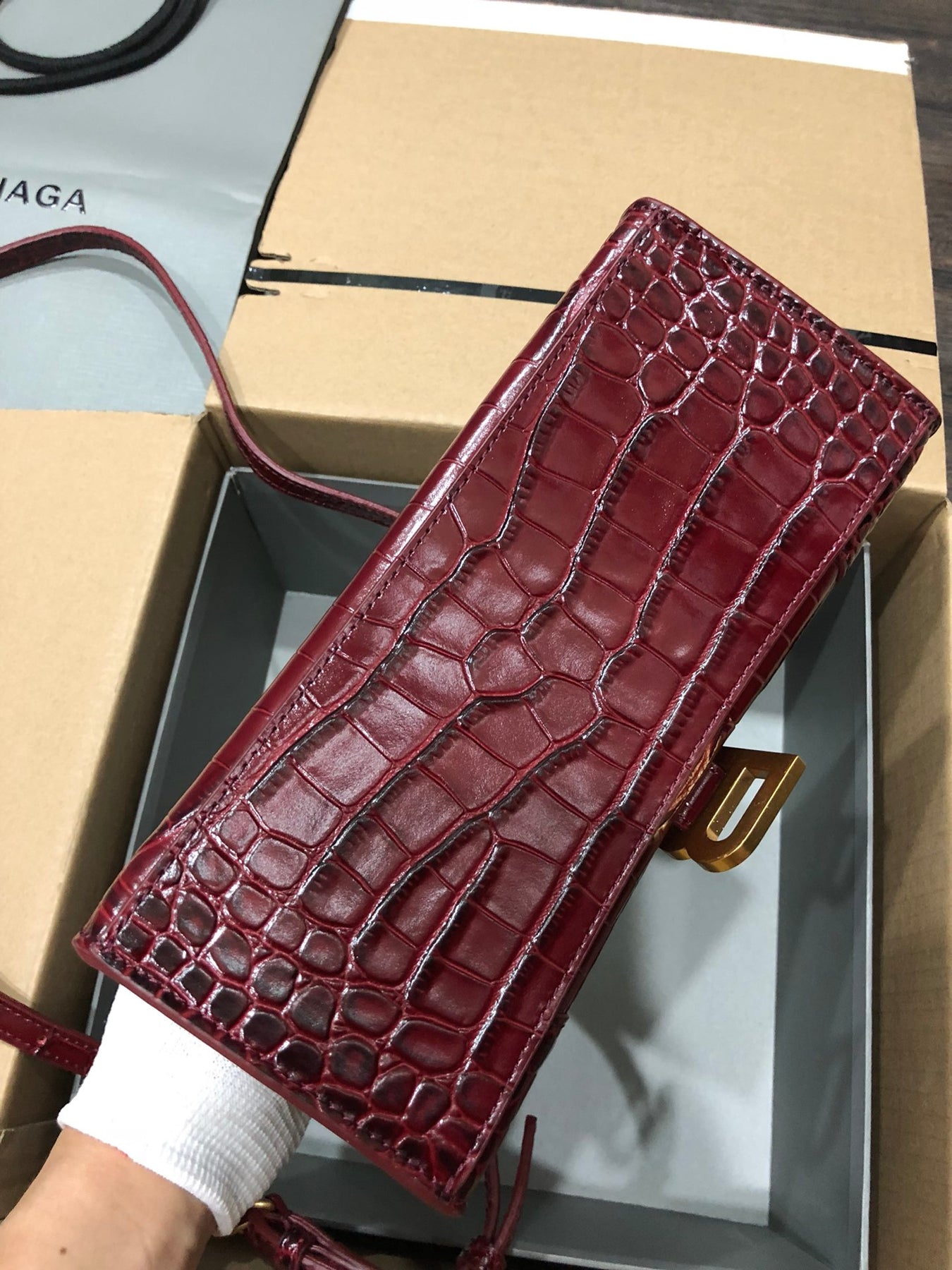 Introducing our Premium Burgundy Crocodile Hourglass Bag, an elevated rendition of the iconic Balenciaga design. Crafted with a luxurious faux crocodile texture, this bag features a striking gold buckle and a distinctive half-moon silhouette that commands attention.
