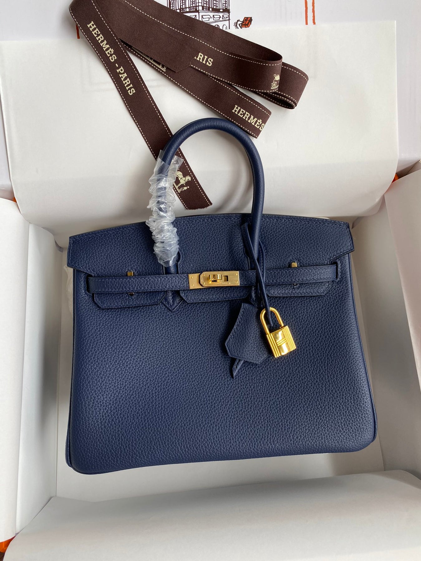 Premium Semi-Handmade Beeswax Leather Bag - Dark Blue Birkin 25cm