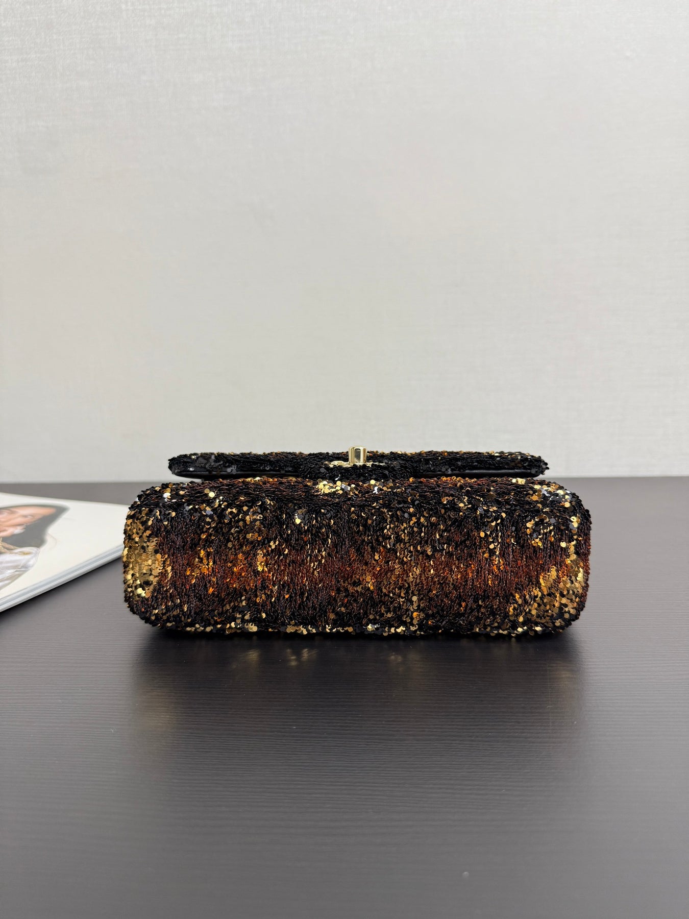Introducing the stunning Spot 25B Sequined CF Flap Bag, a true statement piece for any evening occasion. This exquisite bag features a unique, hot-selling design adorned with shimmering sequins that create a captivating visual effect as they move. Crafted with a luxurious sheepskin lining and durable all-steel hardware, this bag not only offers style but also unmatched quality. The smooth texture of the sequins adds to its allure, making it the perfect accessory for elevating your evening look. Dimensions: 21cm x 8cm x 14cm. Embrace glamour and sophistication with this rare find!