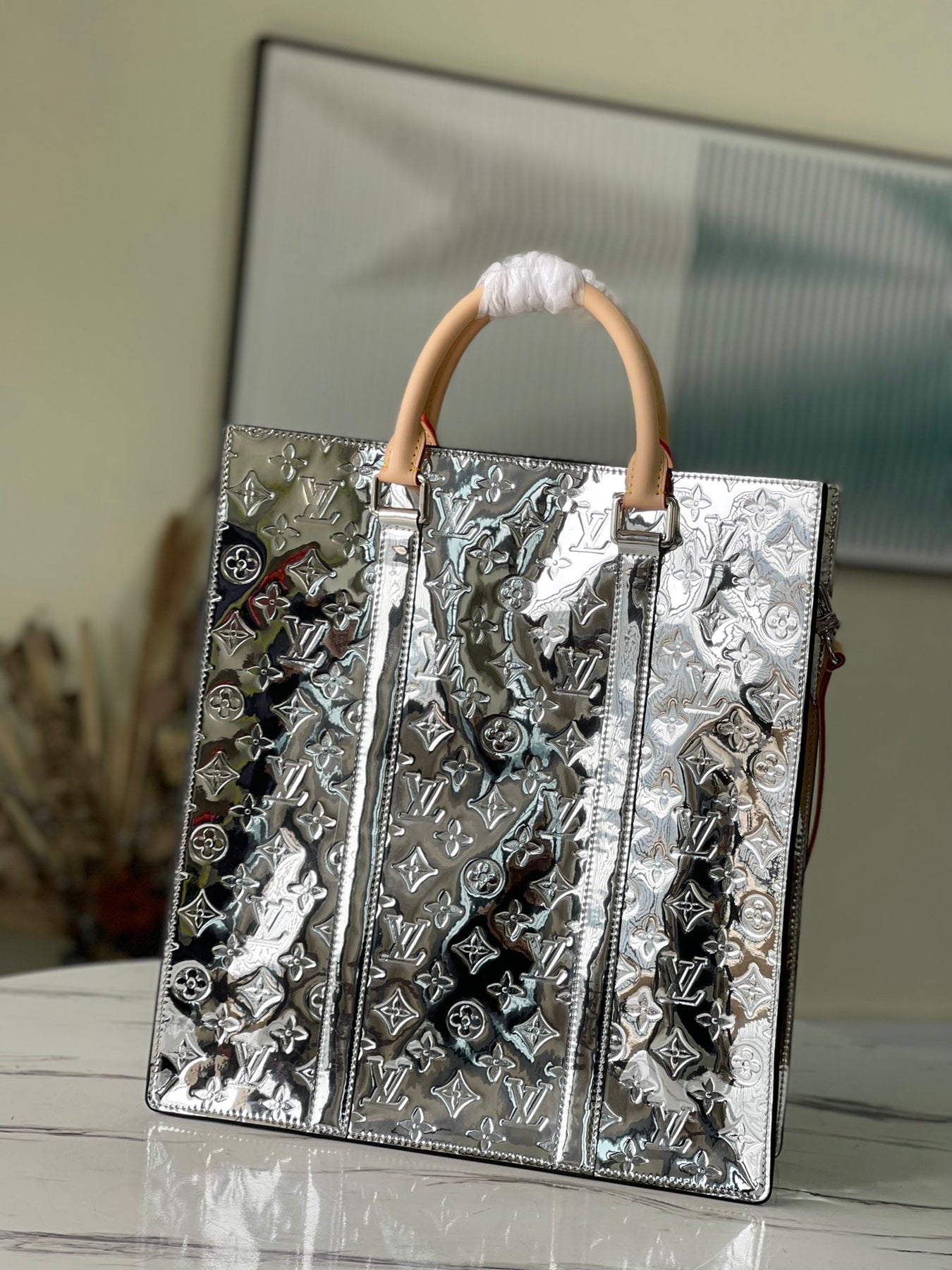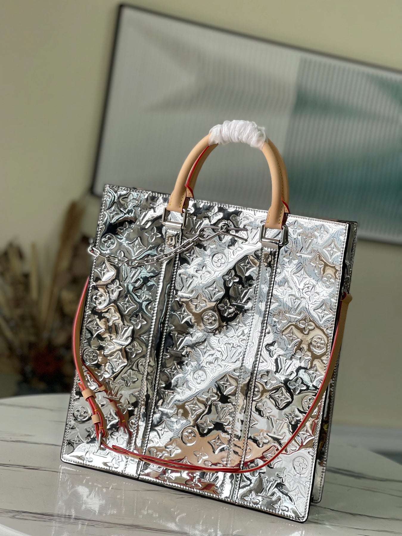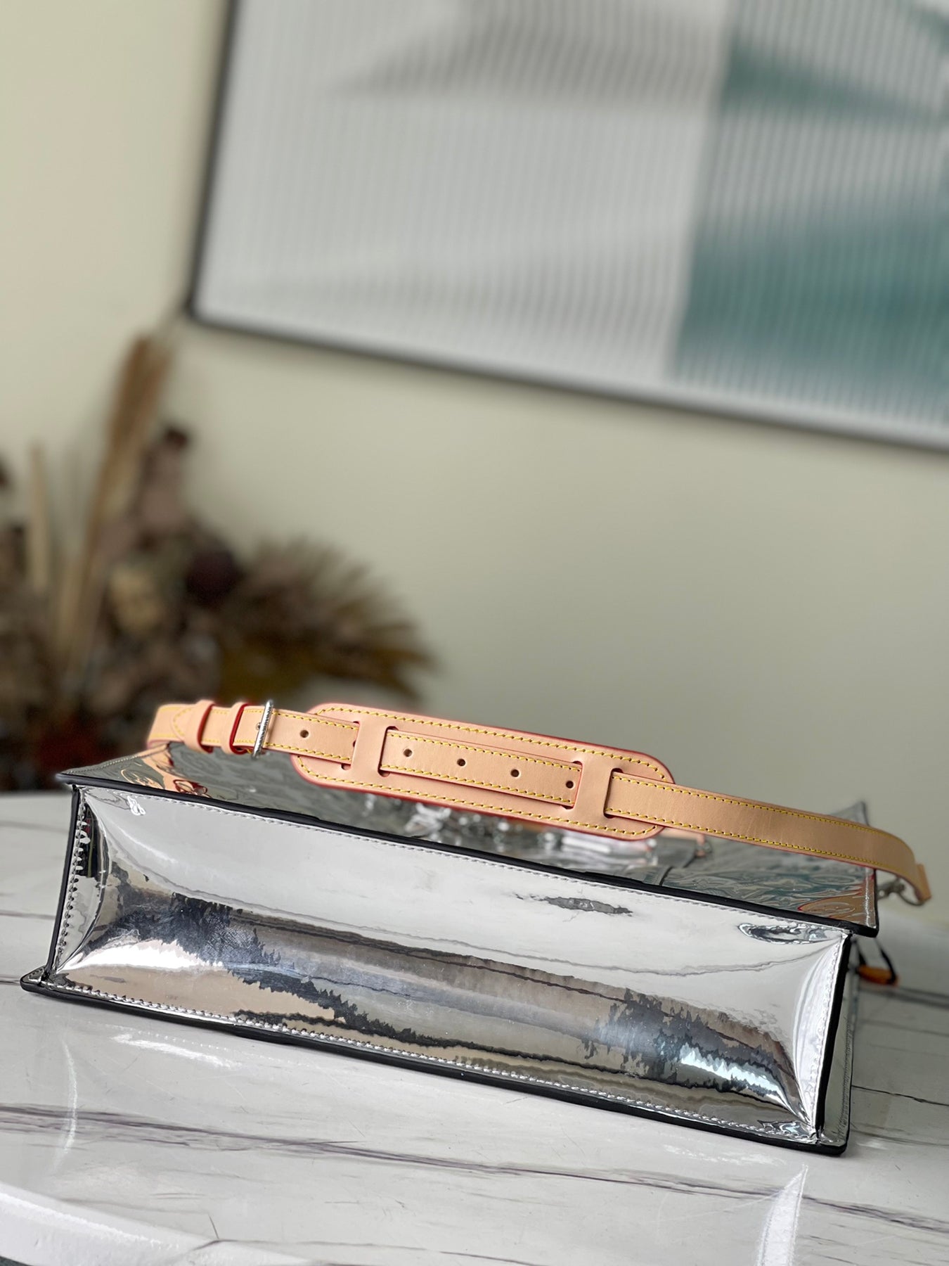 Introducing the Sac Plat handbag from the exclusive 2021-22 Autumn and Winter Mirror Mirror capsule collection. Crafted from Virgil Abloh's innovative reflective Monogram Mirror canvas, this stylish bag is both striking and functional. It features elegant leather handles and personalized name tags, ensuring a sophisticated look. Designed for versatility, the detachable shoulder strap provides a comfortable carrying experience. Dimensions: 36 x 40 x 9 cm. Elevate your accessory collection with this impeccable blend of luxury and contemporary design.