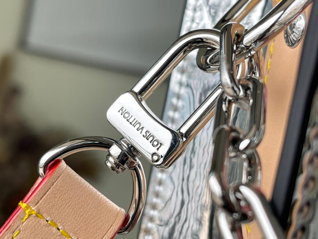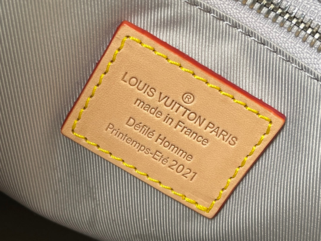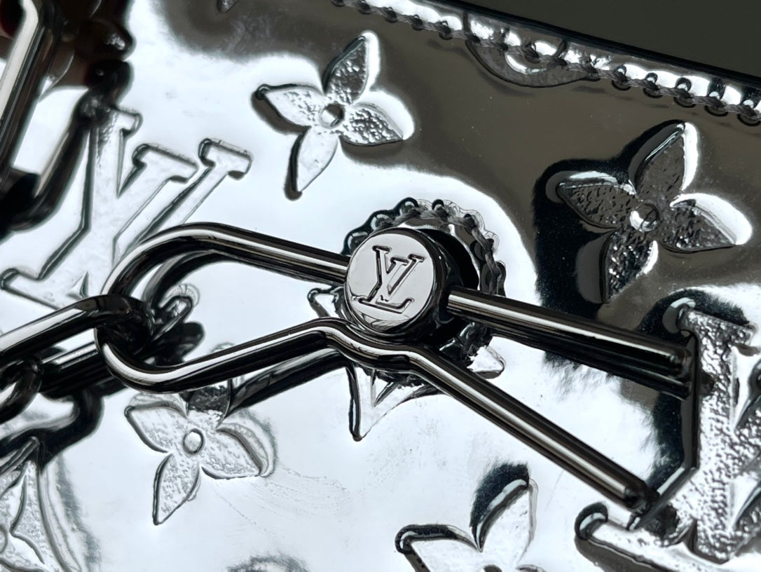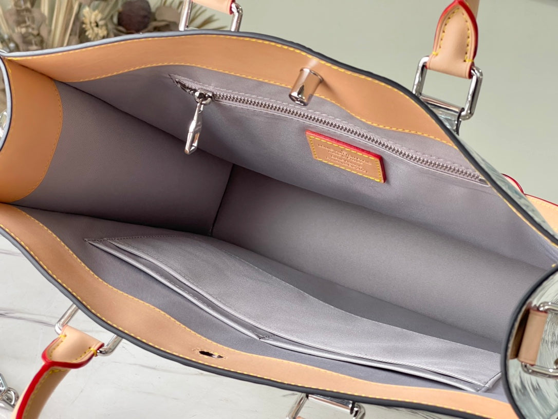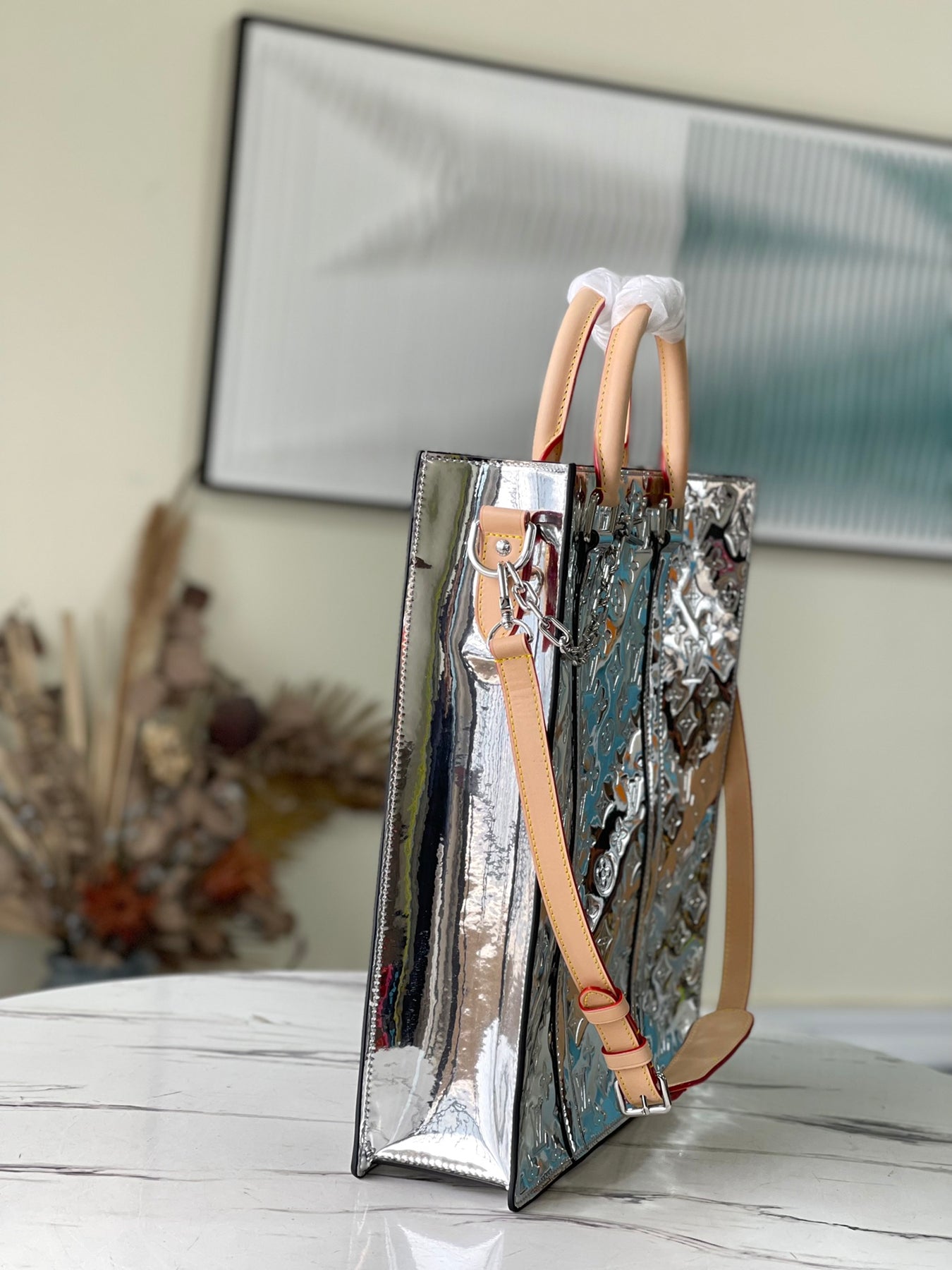 Introducing the Sac Plat handbag from the exclusive 2021-22 Autumn and Winter Mirror Mirror capsule collection. Crafted from Virgil Abloh's innovative reflective Monogram Mirror canvas, this stylish bag is both striking and functional. It features elegant leather handles and personalized name tags, ensuring a sophisticated look. Designed for versatility, the detachable shoulder strap provides a comfortable carrying experience. Dimensions: 36 x 40 x 9 cm. Elevate your accessory collection with this impeccable blend of luxury and contemporary design.