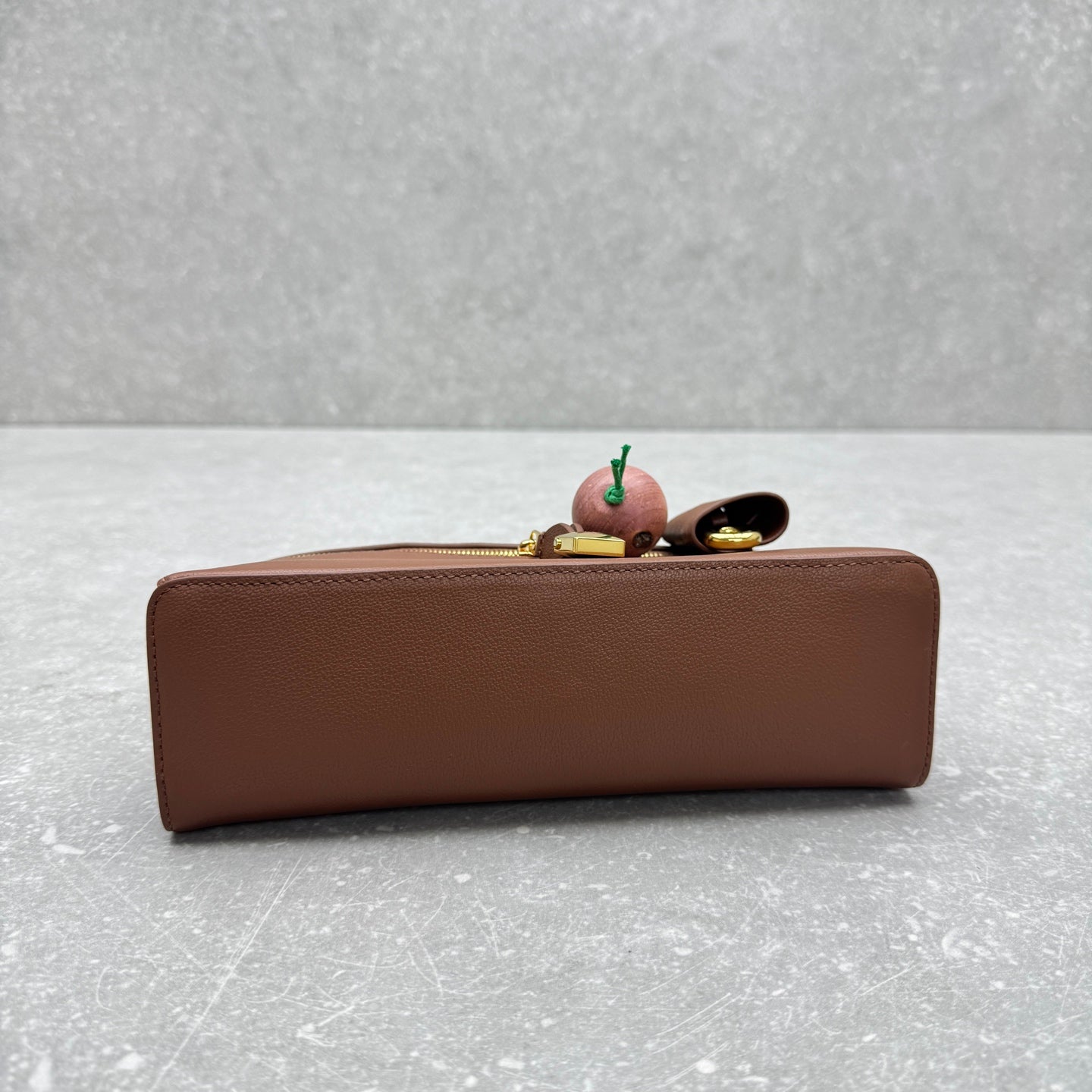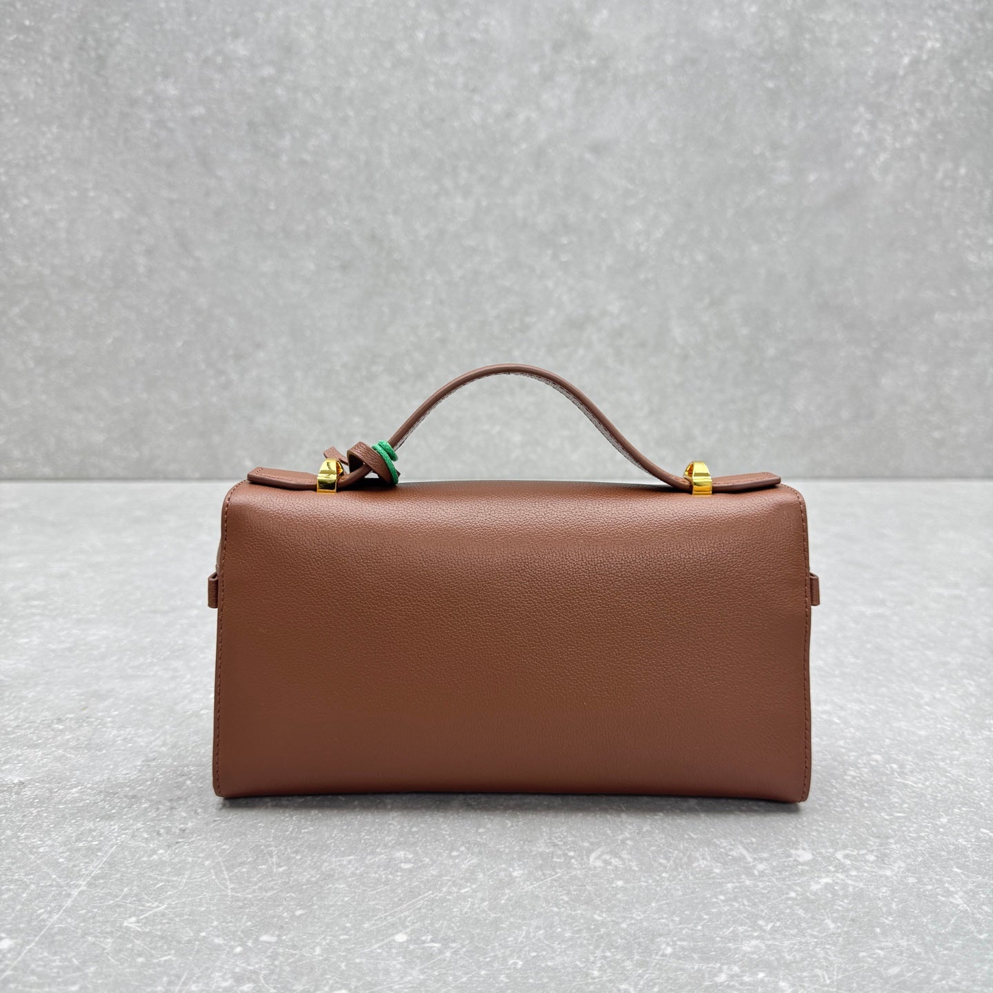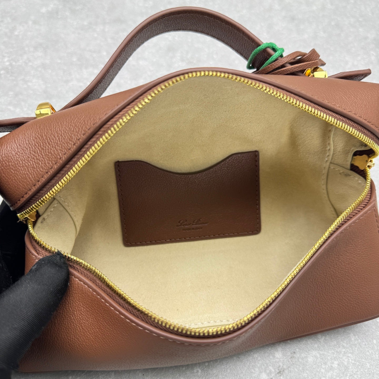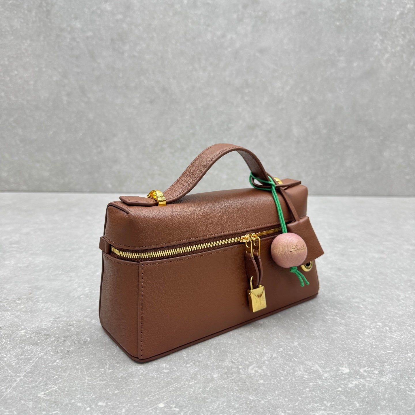 Introducing the Palmprint Brown L23 Bag, a sophisticated addition to your accessory collection. Crafted by Loro Piana, this bag features a classic lunch box shape that effortlessly embodies the timeless elegance of old-money style.