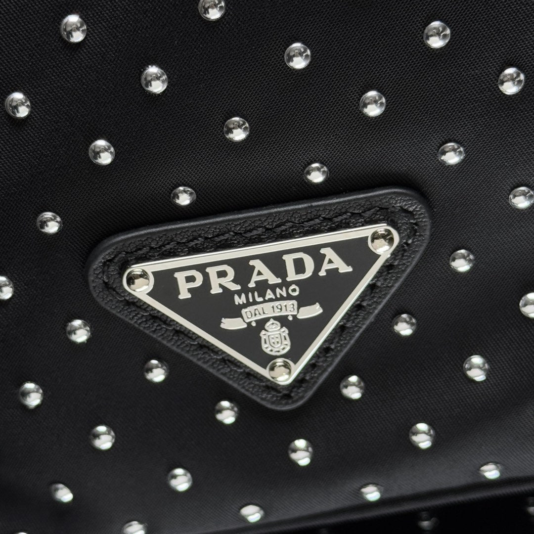 Introducing the Rivet Bucket Bag, the latest 2025 model (1BE067), designed for those who appreciate elegance and practicality. Crafted from high-quality imported nylon fabric, this bag features a stunning rivet design complemented by premium gold hardware, making it a true statement piece.