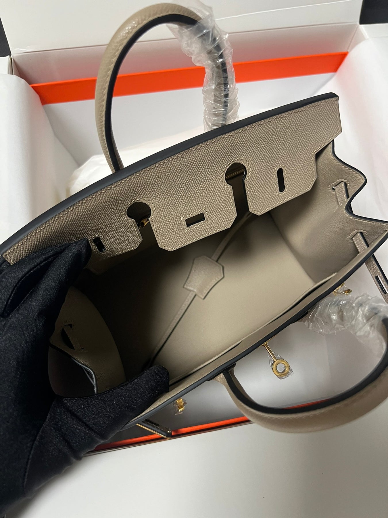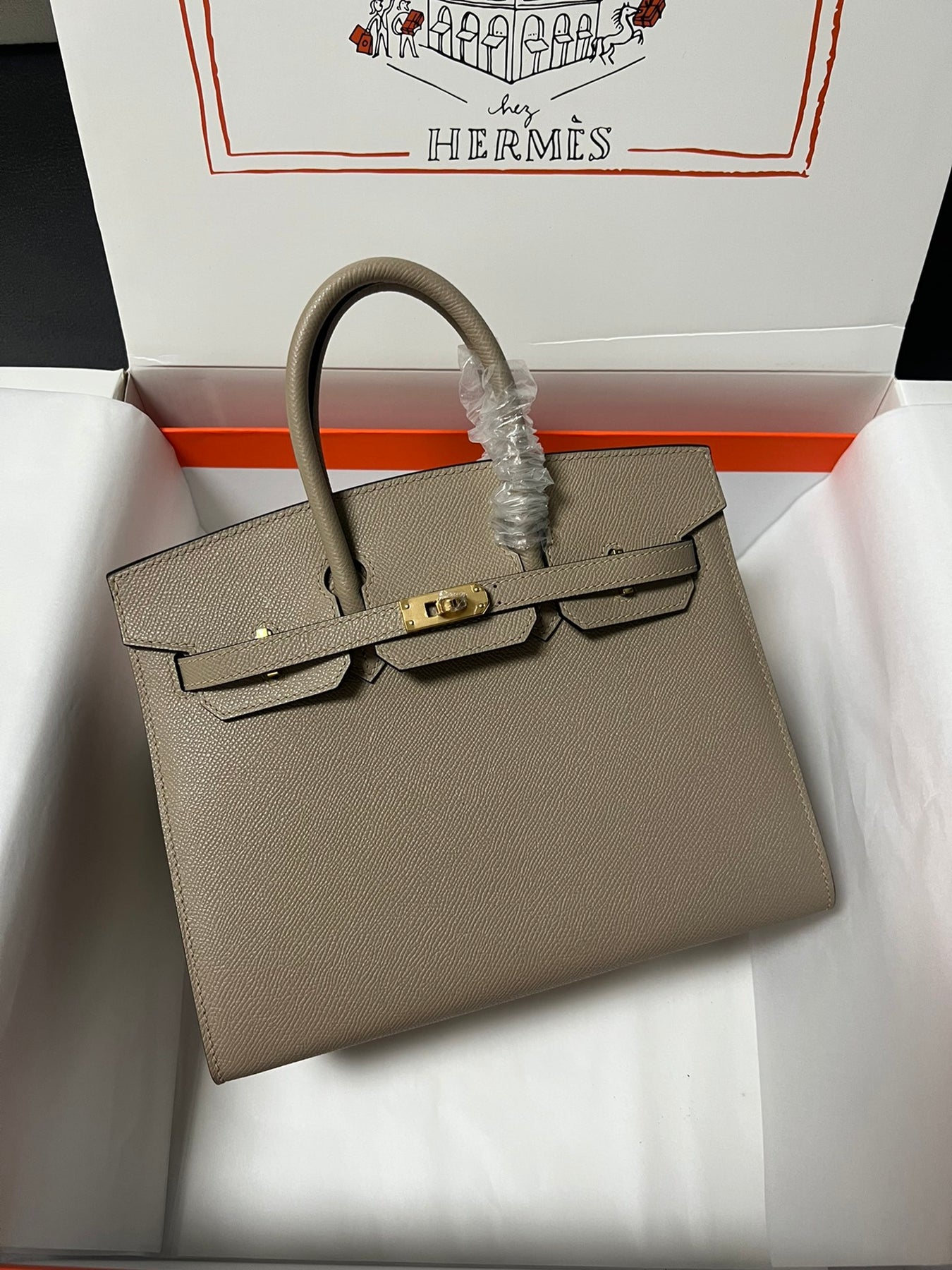 Discover the elegance of our Semi-Handmade 30cm Birkin Sellier, crafted from luxurious waxed Epsom leather in a stunning Turtle Dove Gray. This exquisite handbag features an eye-catching gold and silver palm print design, complemented by a platinum outer seam. Perfect for both everyday use and special occasions, this sophisticated accessory effortlessly blends style and functionality. Enhance your luxury collection with this timeless piece.