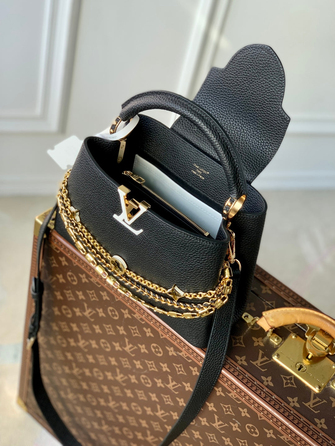 Introducing the Small Capucines Bag from the Trilogy collection—a perfect embodiment of elegance and sophistication. Crafted from luxurious Taurillon leather, this exquisite bag showcases stunning hardware, including a chain adorned with a mini padlock and an enamel Monogram flower. Versatile in design, the flap can be positioned either externally or internally, providing easy access to multiple pockets for optimal organization. Elevate your style with this chic accessory, thoughtfully designed for a range of carrying experiences.