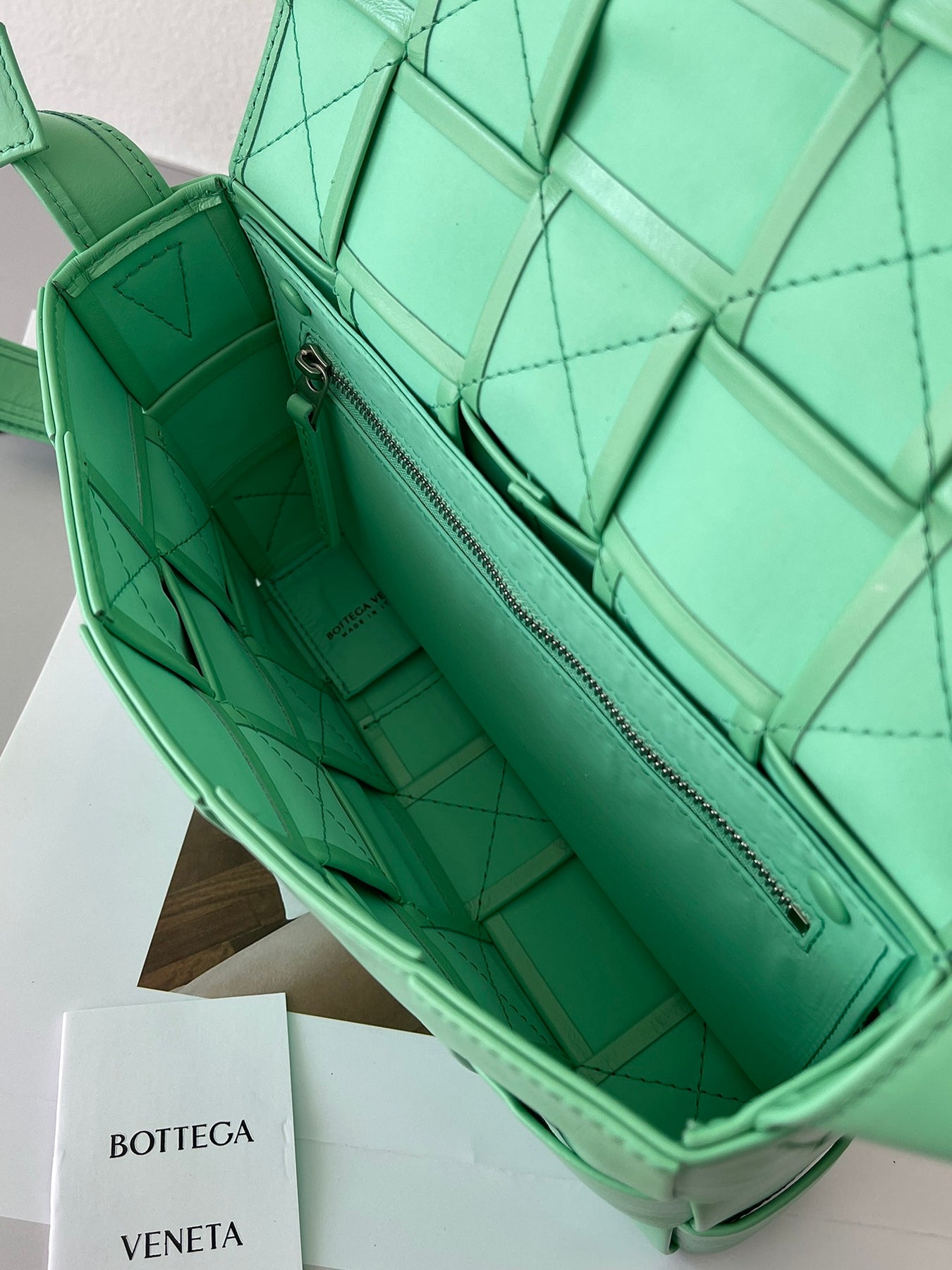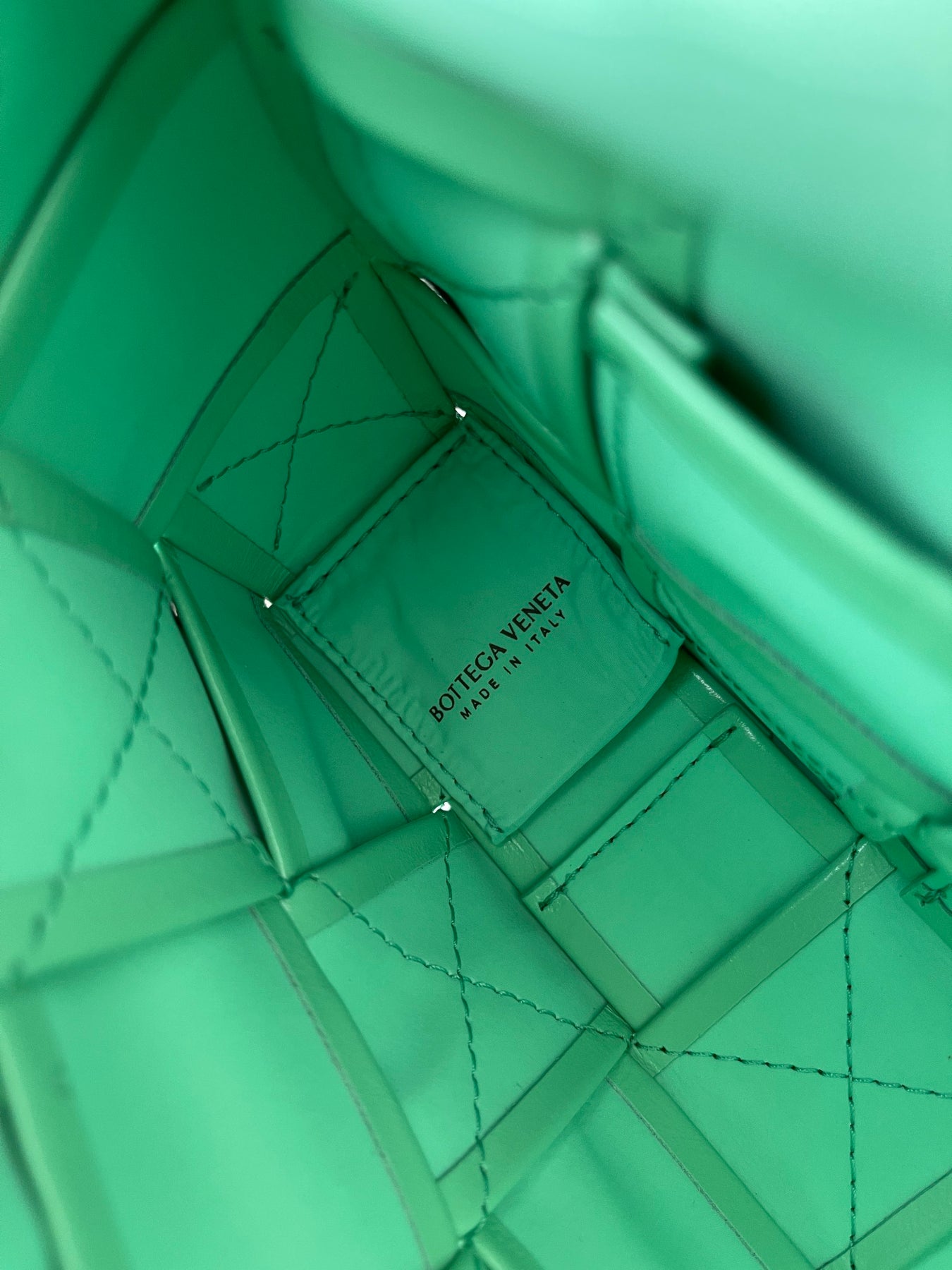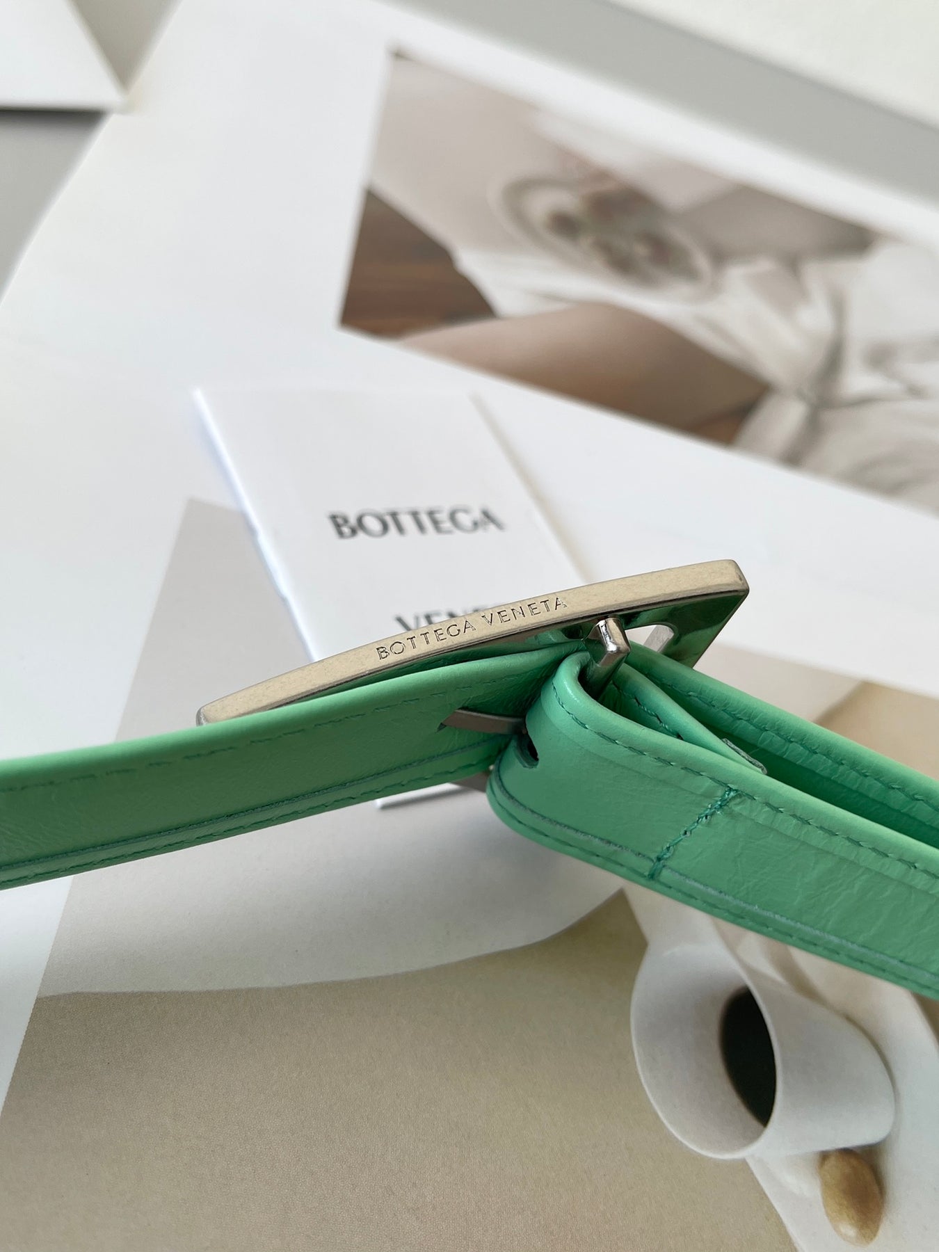 Introducing the Spring Green "Cassette" Bag by Botega Veneta, a stunning blend of elegance and craftsmanship. This luxurious bag is made from premium waxed shiny calfskin and features Jindian’s distinctive triangle hardware, emphasizing its unique design. The intricate 5×3 braided construction adds a touch of sophistication, making it perfect for any occasion.