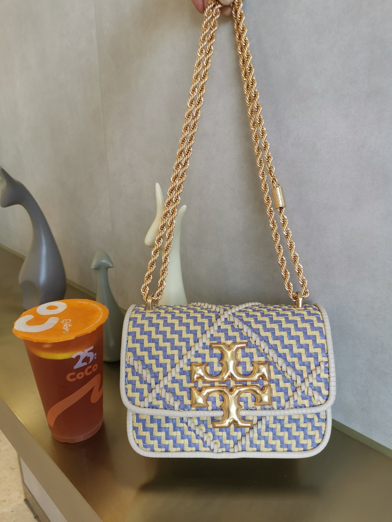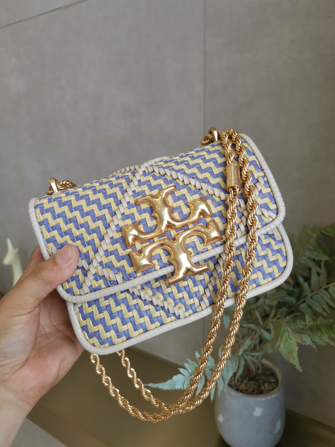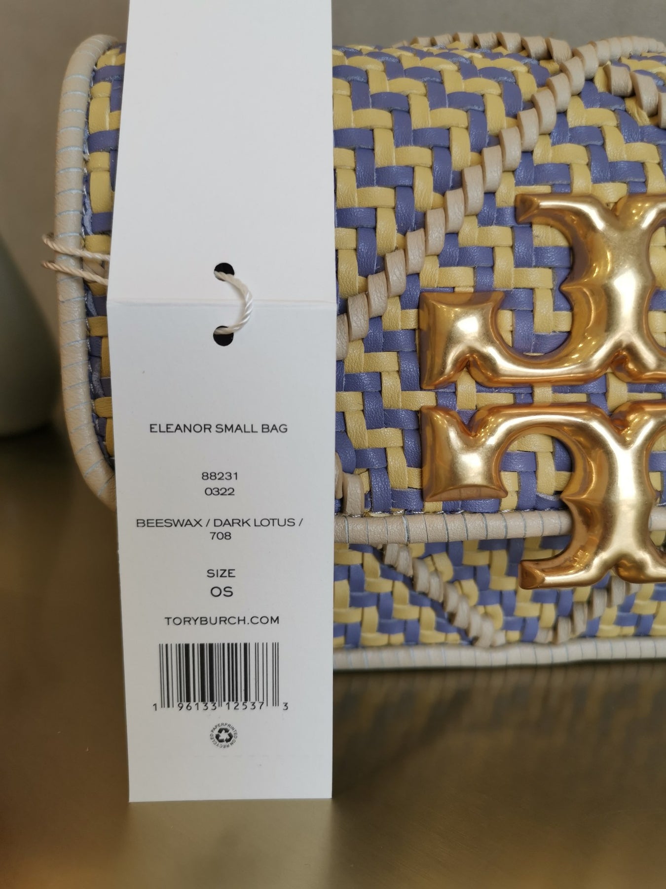Elevate your accessory collection with the Tory Burch Eleanor Accordion Bag, meticulously crafted from luxurious Napa cowhide. This stylish bag features a chic woven design, complemented by a durable hardware chain for added elegance. With dimensions of 19 x 13.5 x 6.5 inches, it offers ample space while maintaining a compact silhouette. Inside, you'll find a convenient zipper pocket and an internal slip pocket for organization, making it perfect for both everyday use and special occasions. Discover the perfect blend of fashion and function with the Tory Burch Eleanor bag.