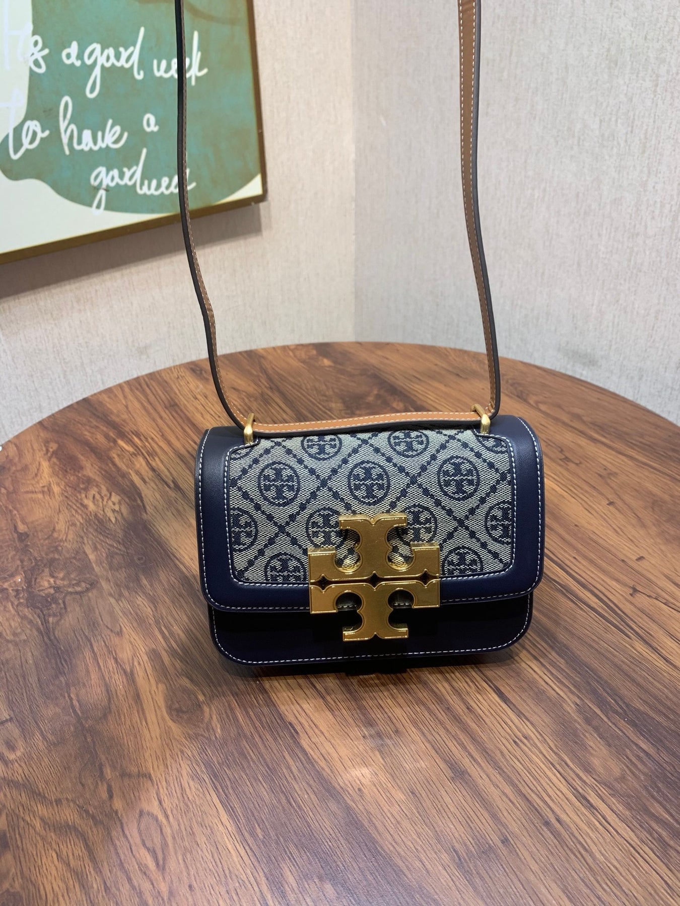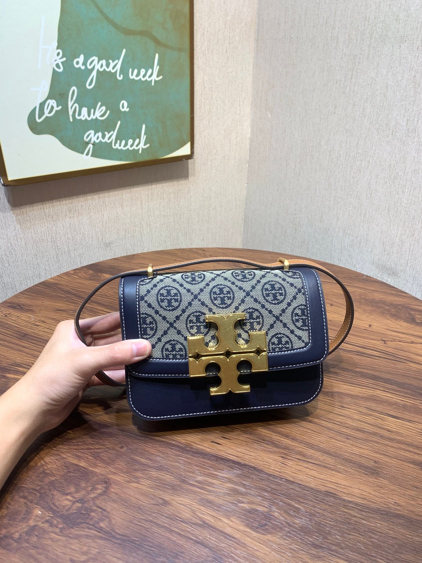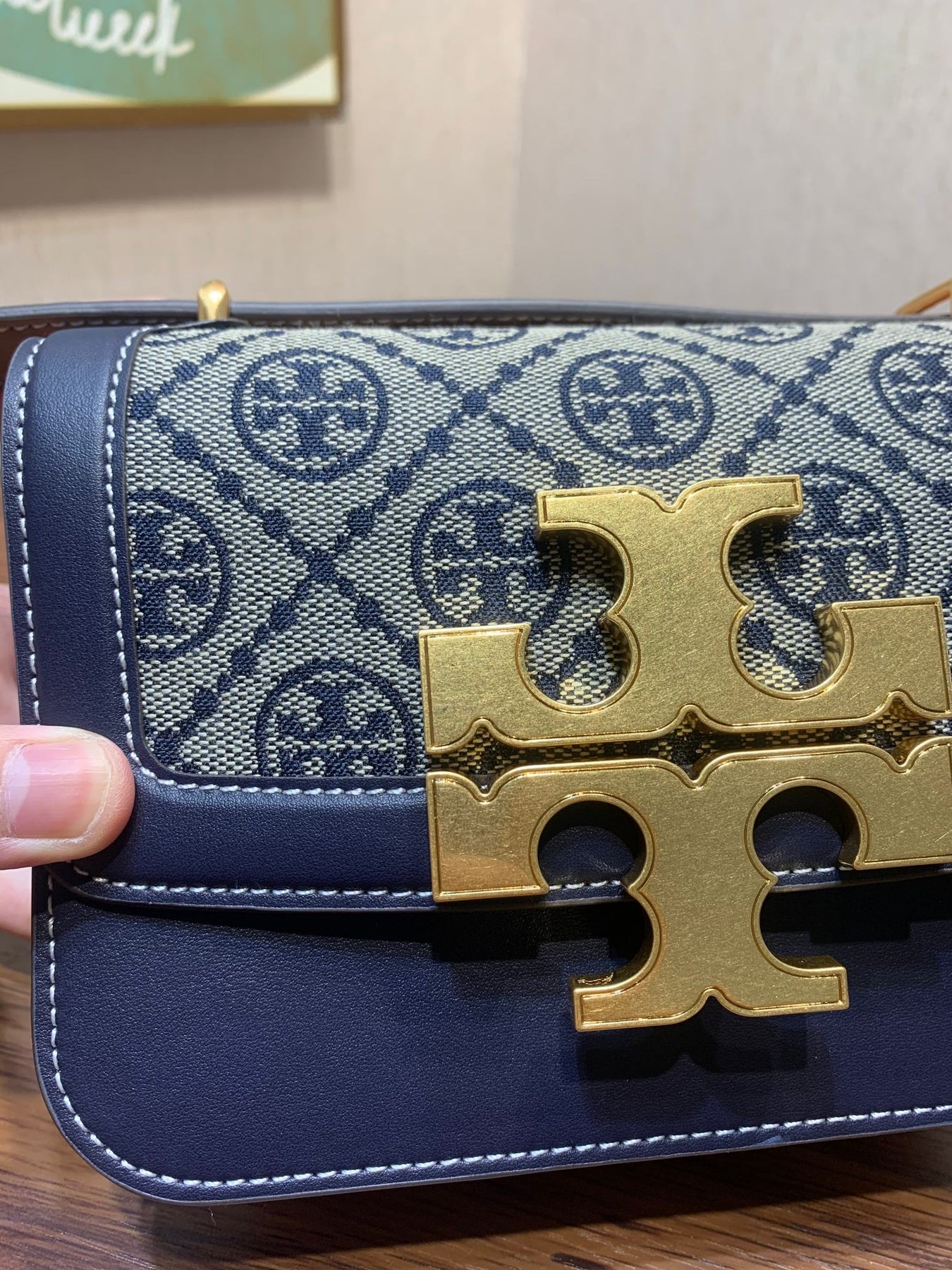 Elevate your style with the Tory Burch Eleanor T Monogram Small Shoulder Bag, crafted from luxurious jacquard and nappa leather, complemented by leather trim. This sophisticated accessory features a magnetic flip cover for easy access and an adjustable leather crossbody strap, allowing for a comfortable fit with a vertical carry height of 54 cm.