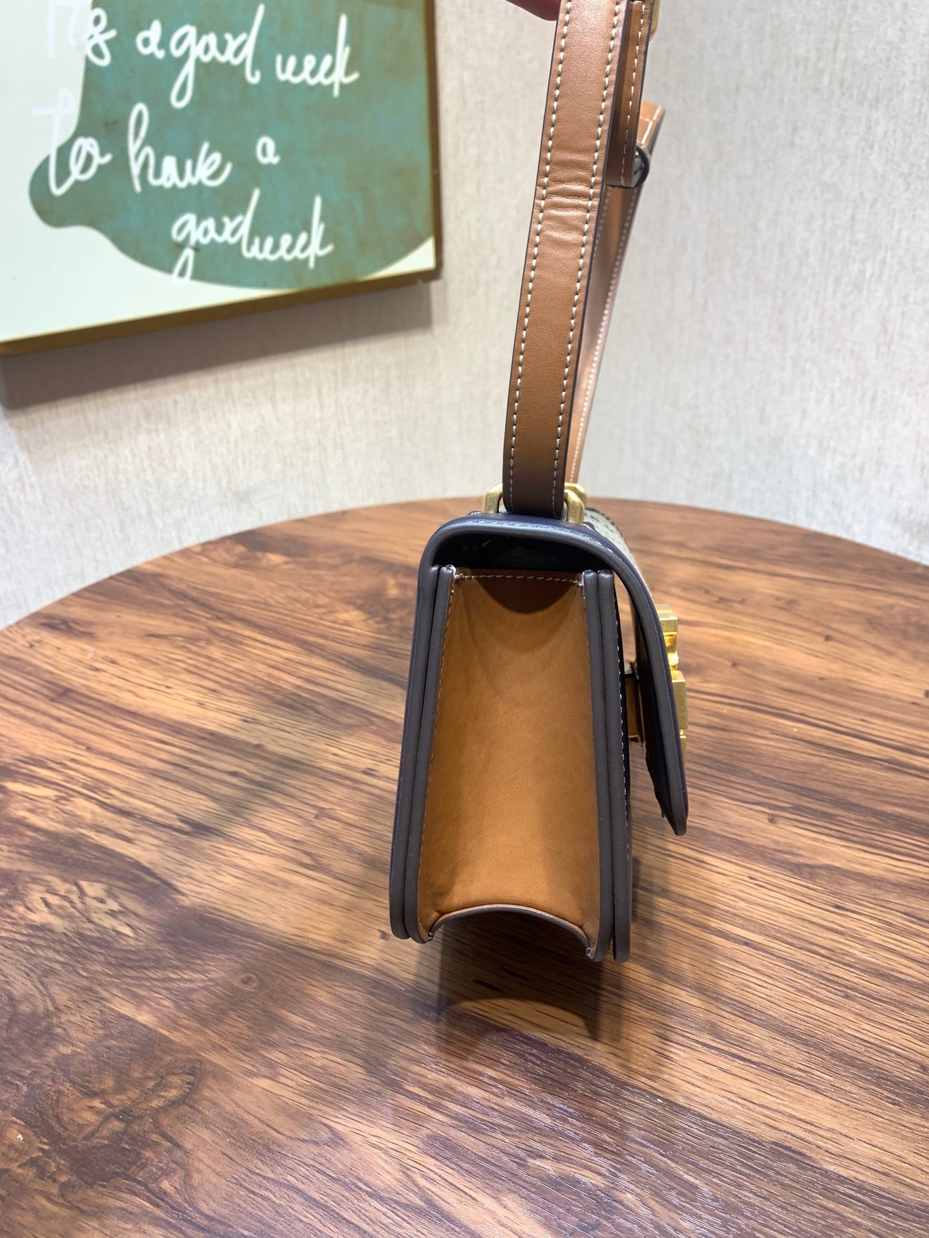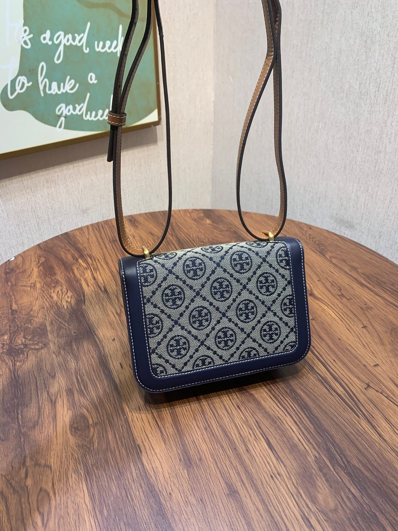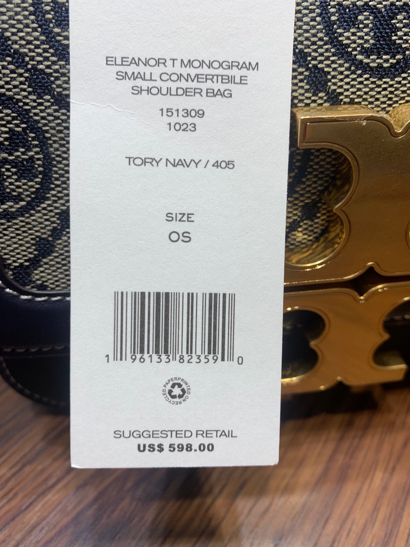 Elevate your style with the Tory Burch Eleanor T Monogram Small Shoulder Bag, crafted from luxurious jacquard and nappa leather, complemented by leather trim. This sophisticated accessory features a magnetic flip cover for easy access and an adjustable leather crossbody strap, allowing for a comfortable fit with a vertical carry height of 54 cm.