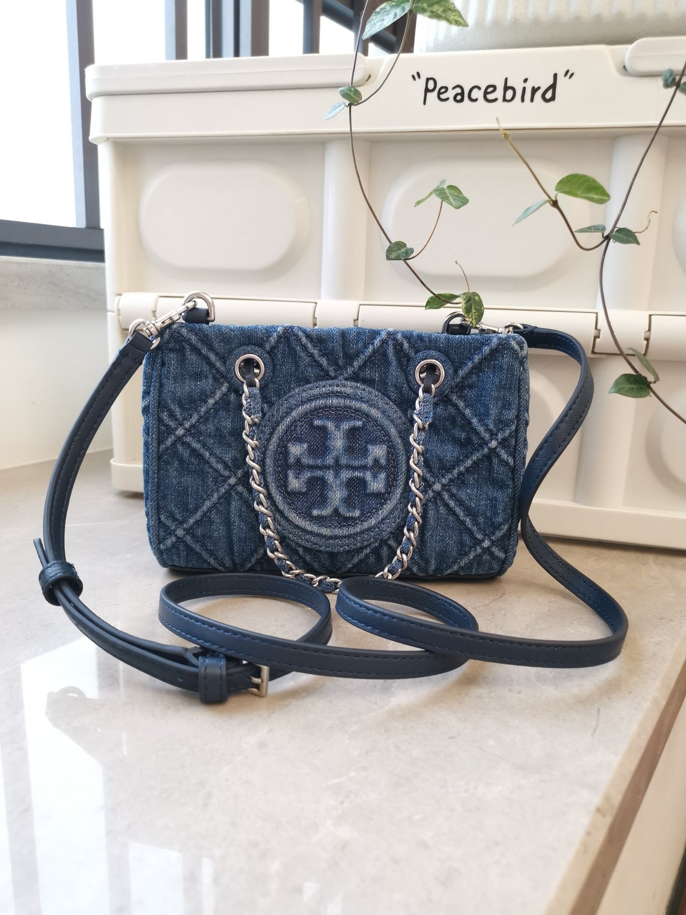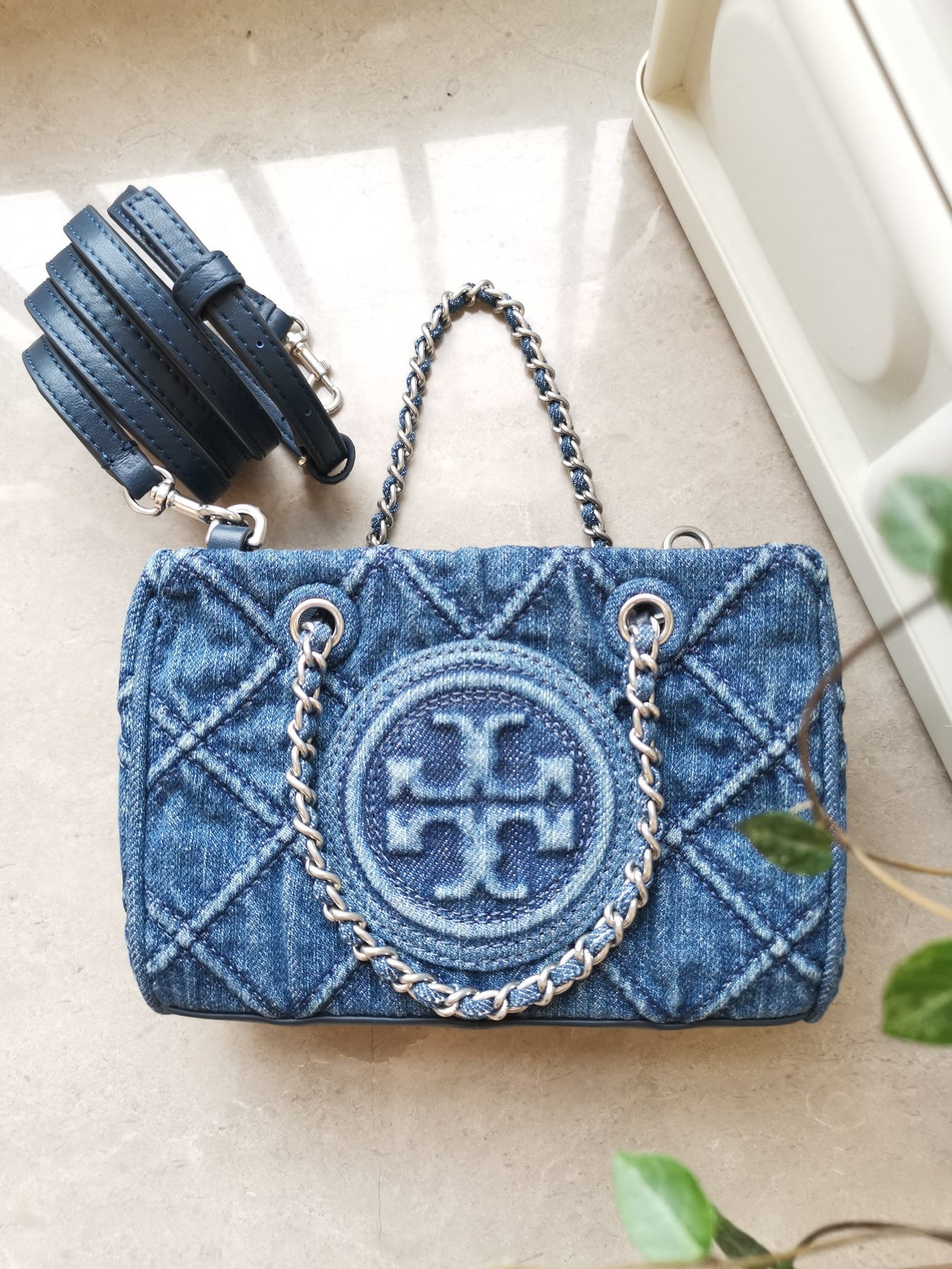 Tory Burch Fleming Classic Mini Denim Chain Tote Bag
