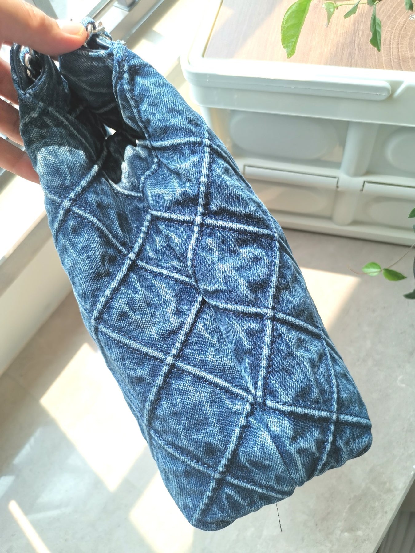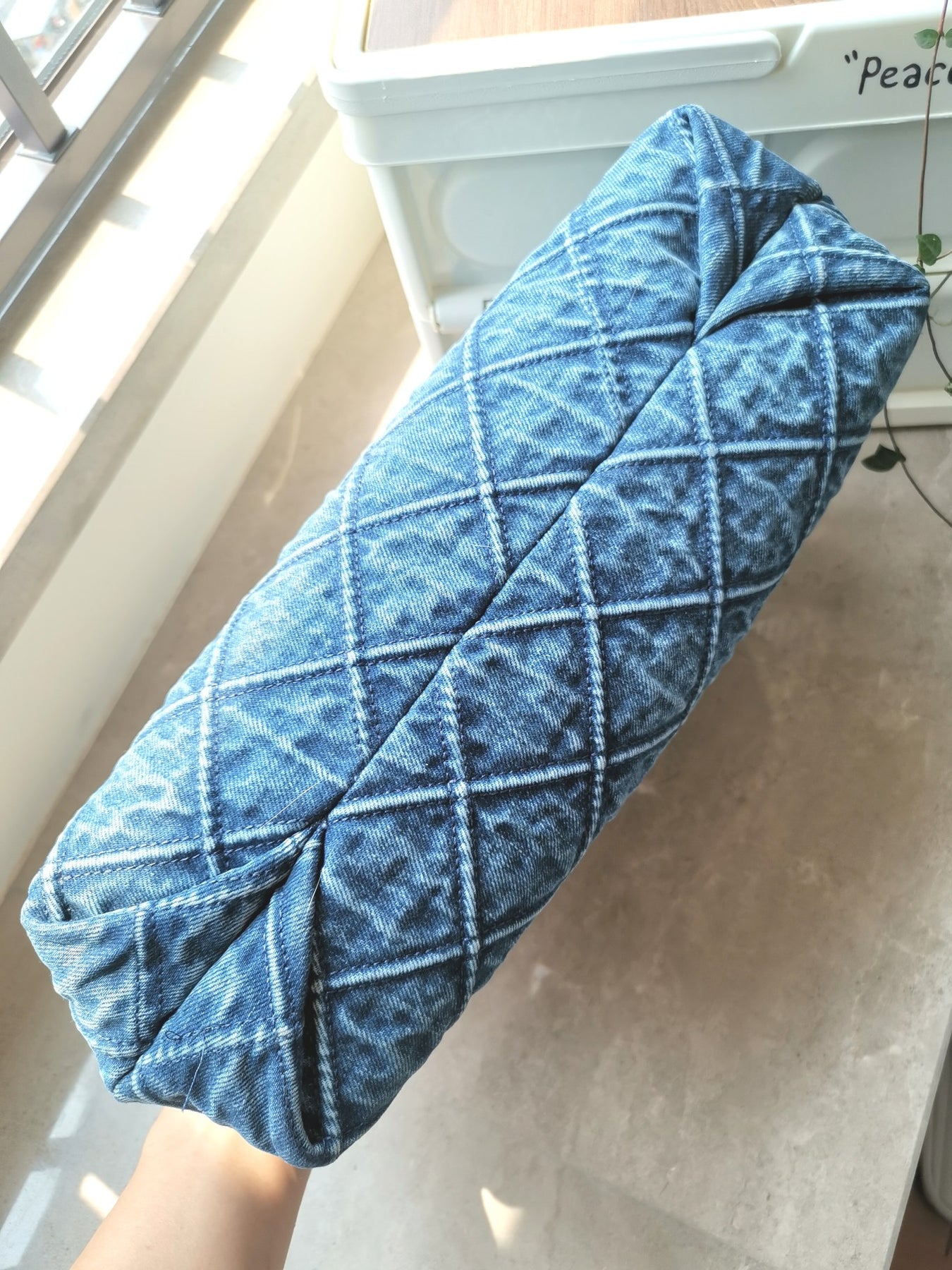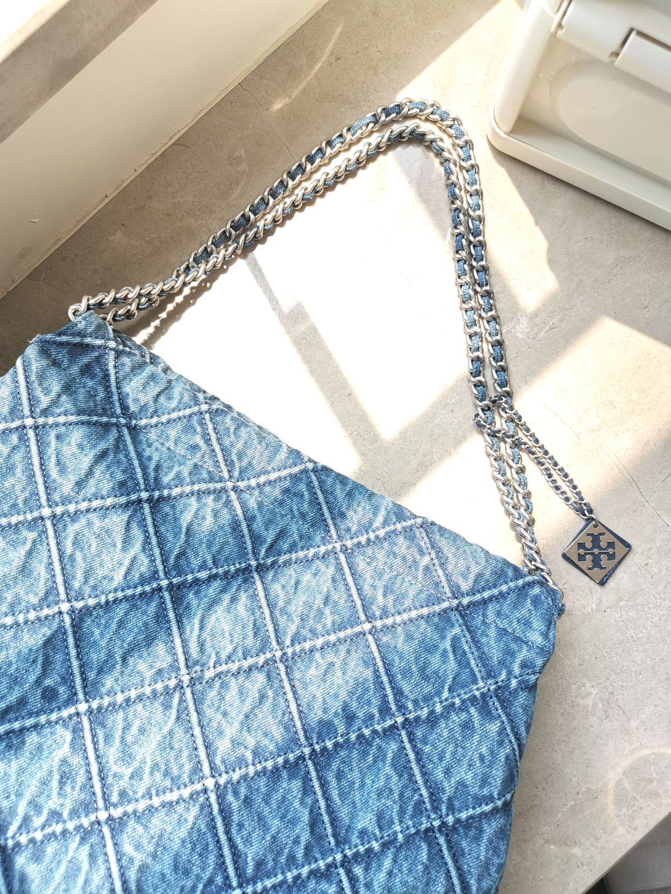 Introducing the TORY BURCH Fleming Shoulder Bag in a stunning denim blue. This elegant shopping bag combines classic charm with modern style, featuring a unique rhombus ruffle design crafted from luxurious sheepskin. The soft suede lining adds an extra touch of sophistication, making it the perfect accessory for any occasion.