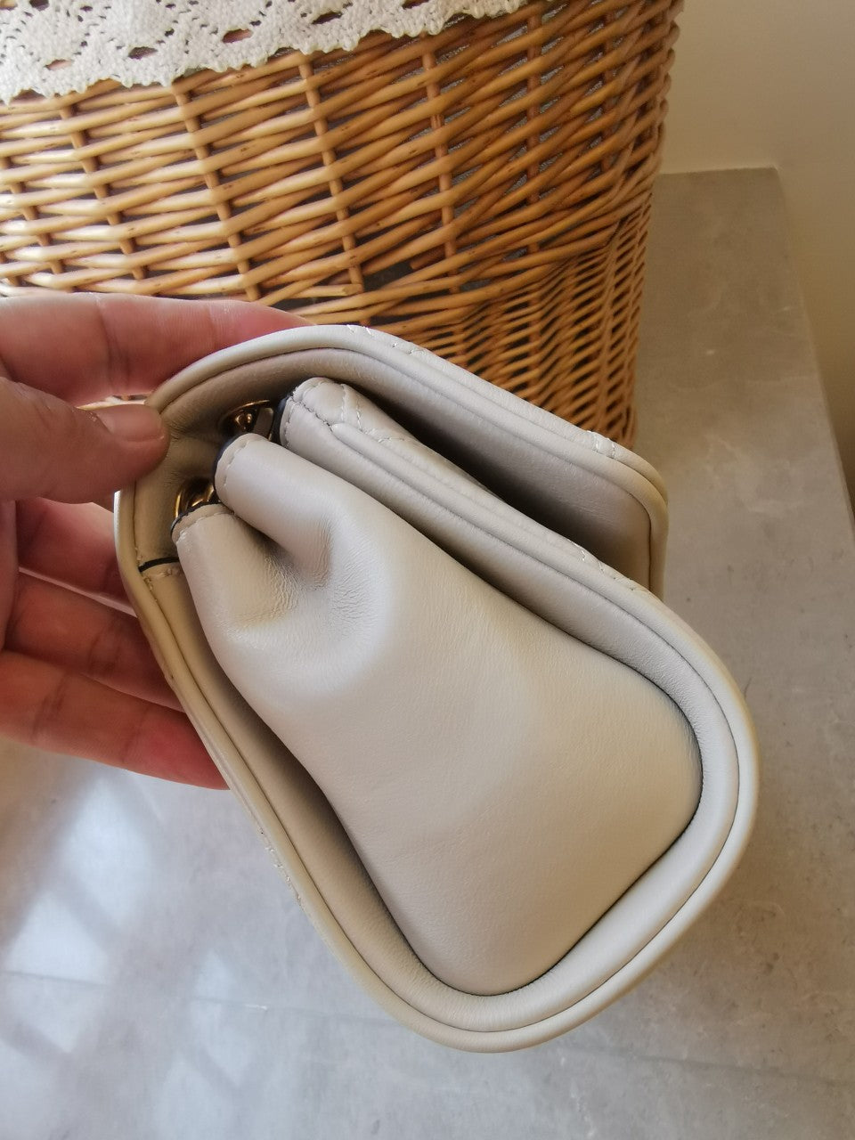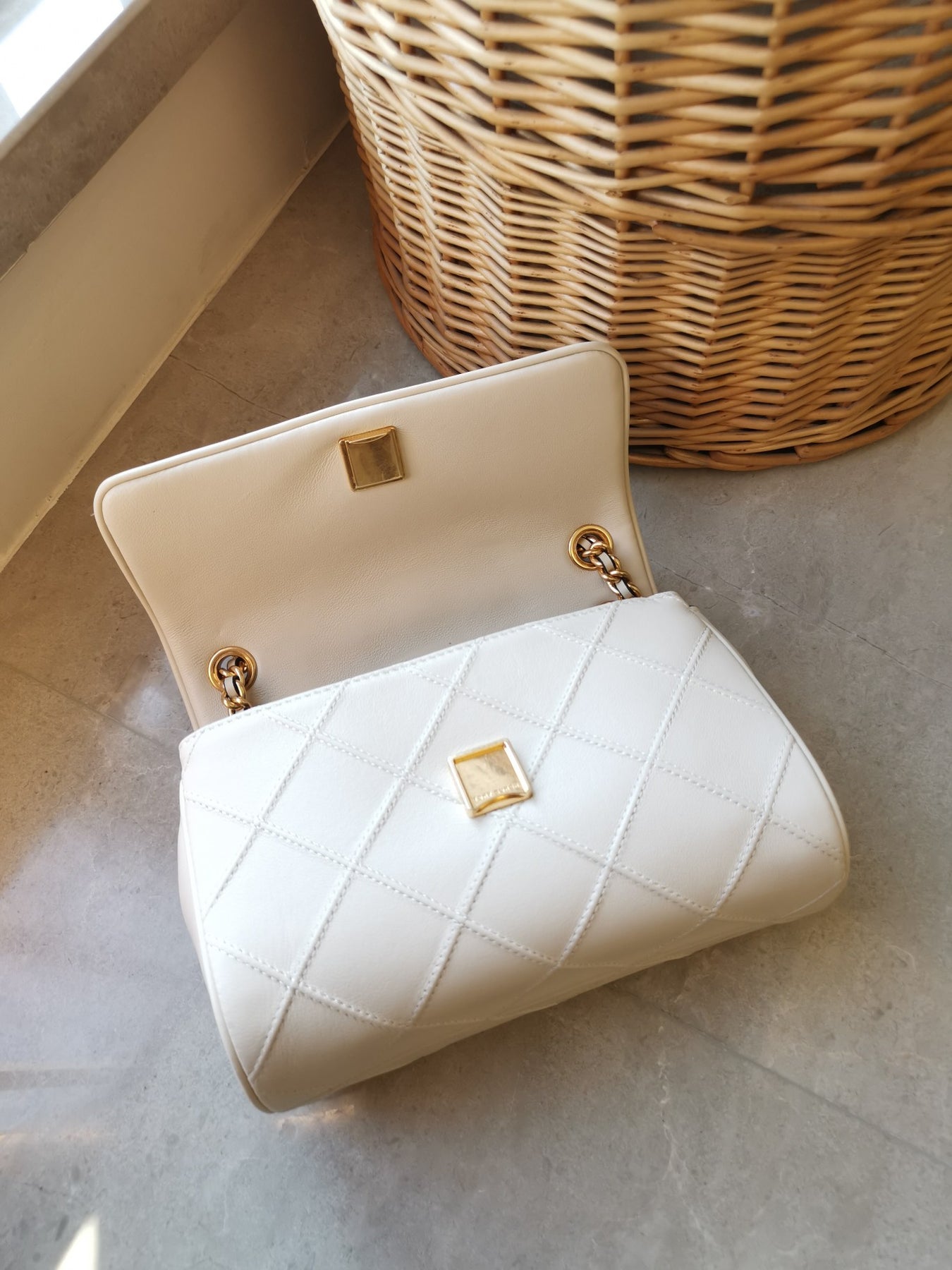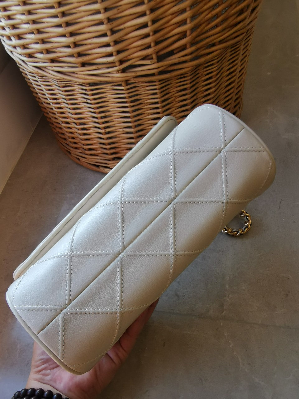 Designed for versatility, the bag includes an adjustable two-way chain strap with a braided leather design, allowing you to carry it comfortably at a vertical height of 56.5 cm. With a flip top secured by a magnetic snap, you'll find easy access to the interior, which includes a front slip pocket and a central zipped pocket for organization.