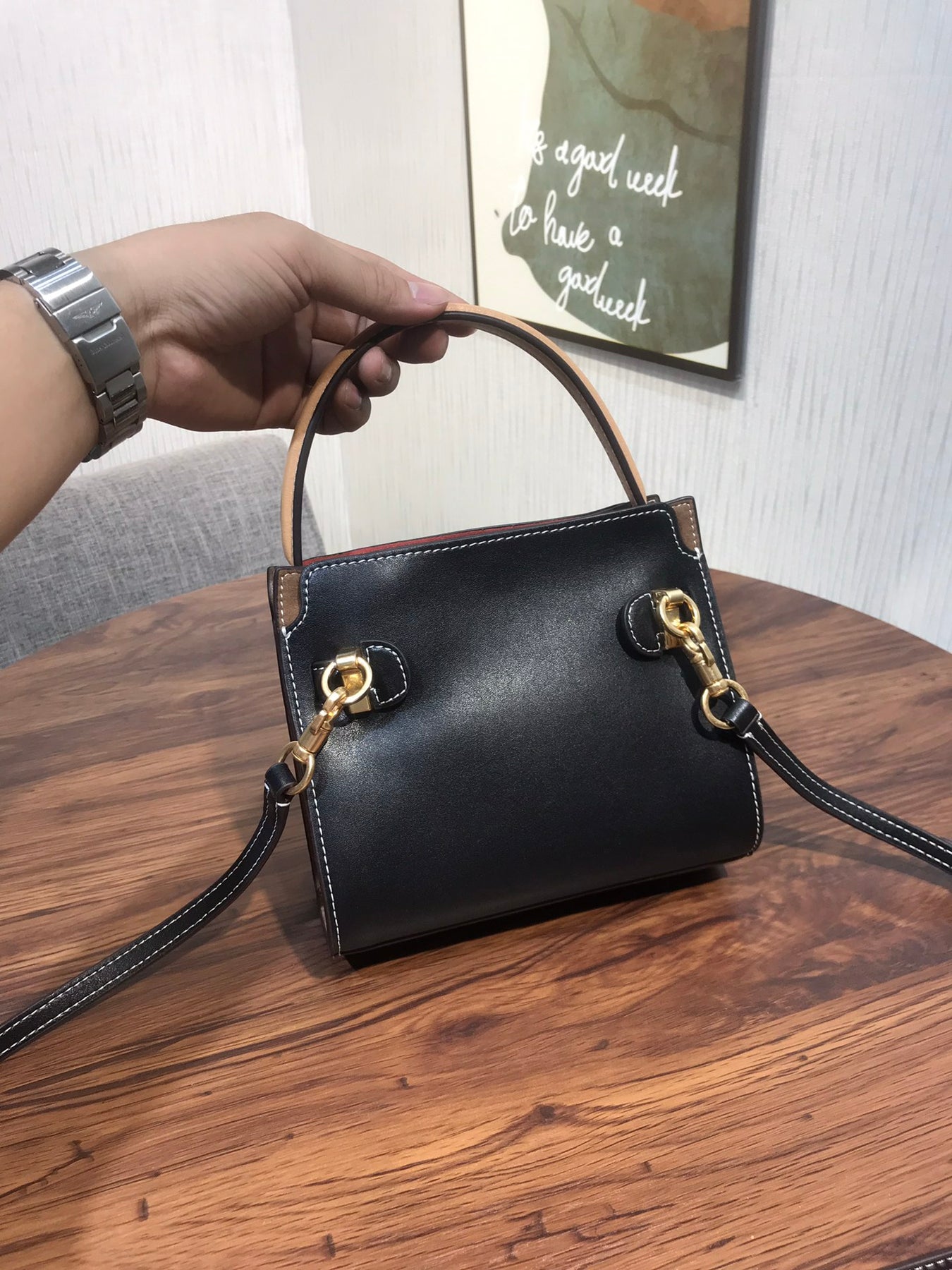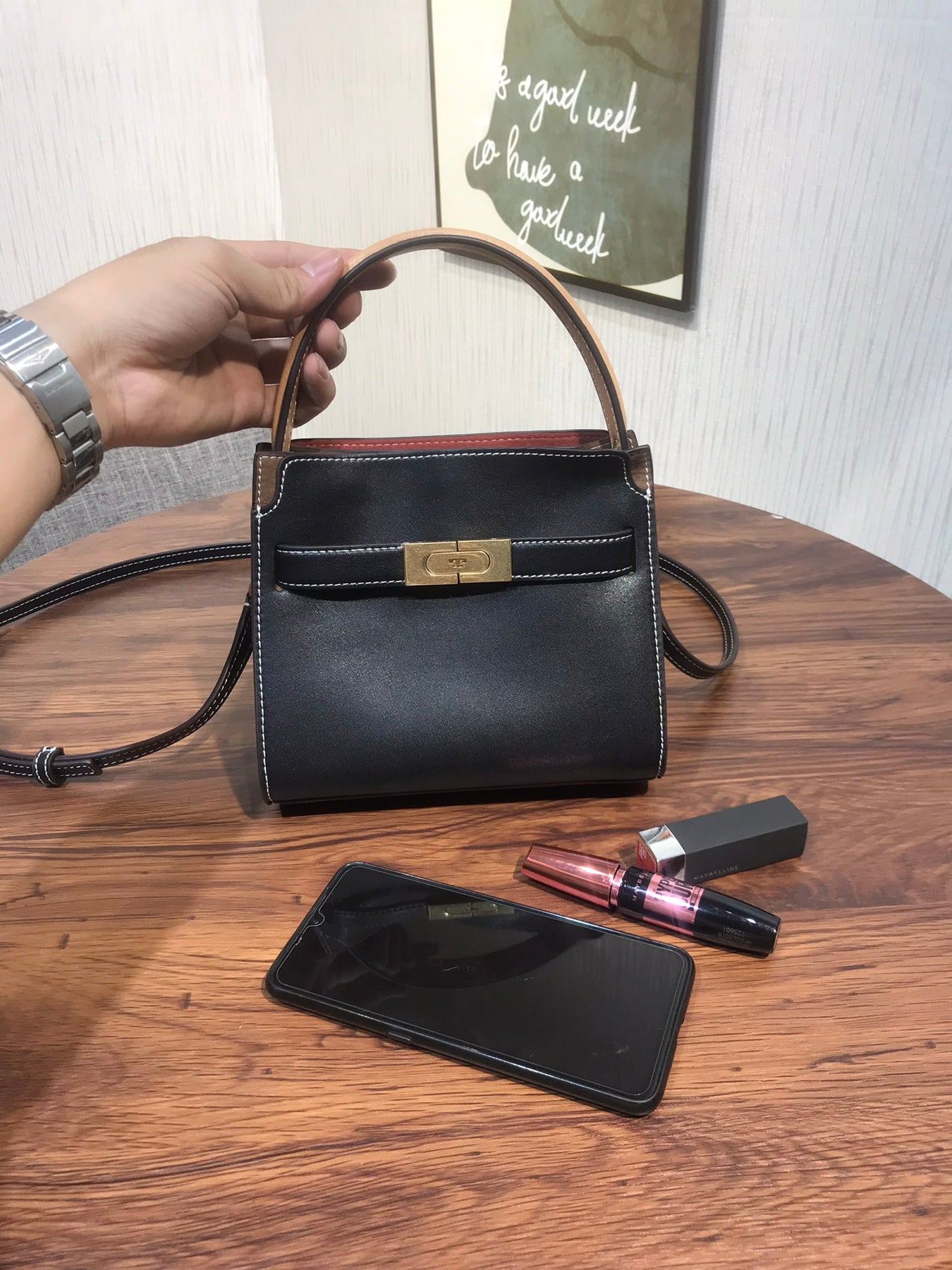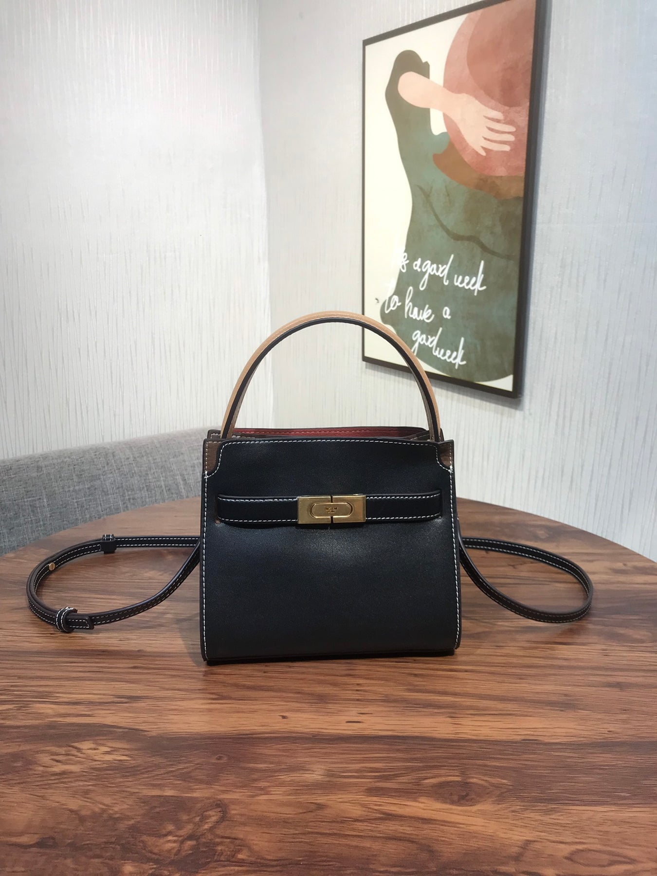 Introducing the Tory Burch Lee Radziwill Petite Double Bag in elegant black. This charming mini bag is a perfect blend of sophistication and functionality. With its innovative lock design and premium mixed materials, it exudes a unique allure. Its compact size (19 x 16.5 x 8.5 cm) ensures it remains lightweight while providing ample space for essentials. Versatile and stylish, this bag effortlessly complements any outfit, making it an ideal choice for various occasions. Elevate your summer wardrobe with this exquisite piece from Tory Burch.