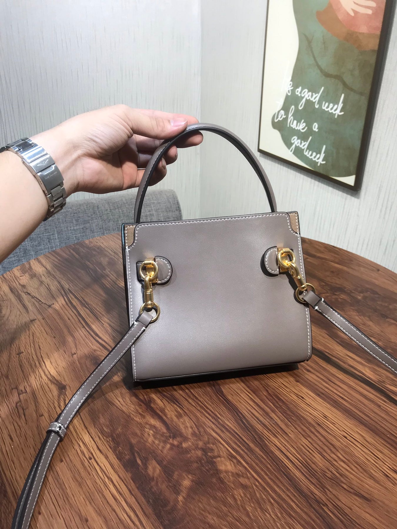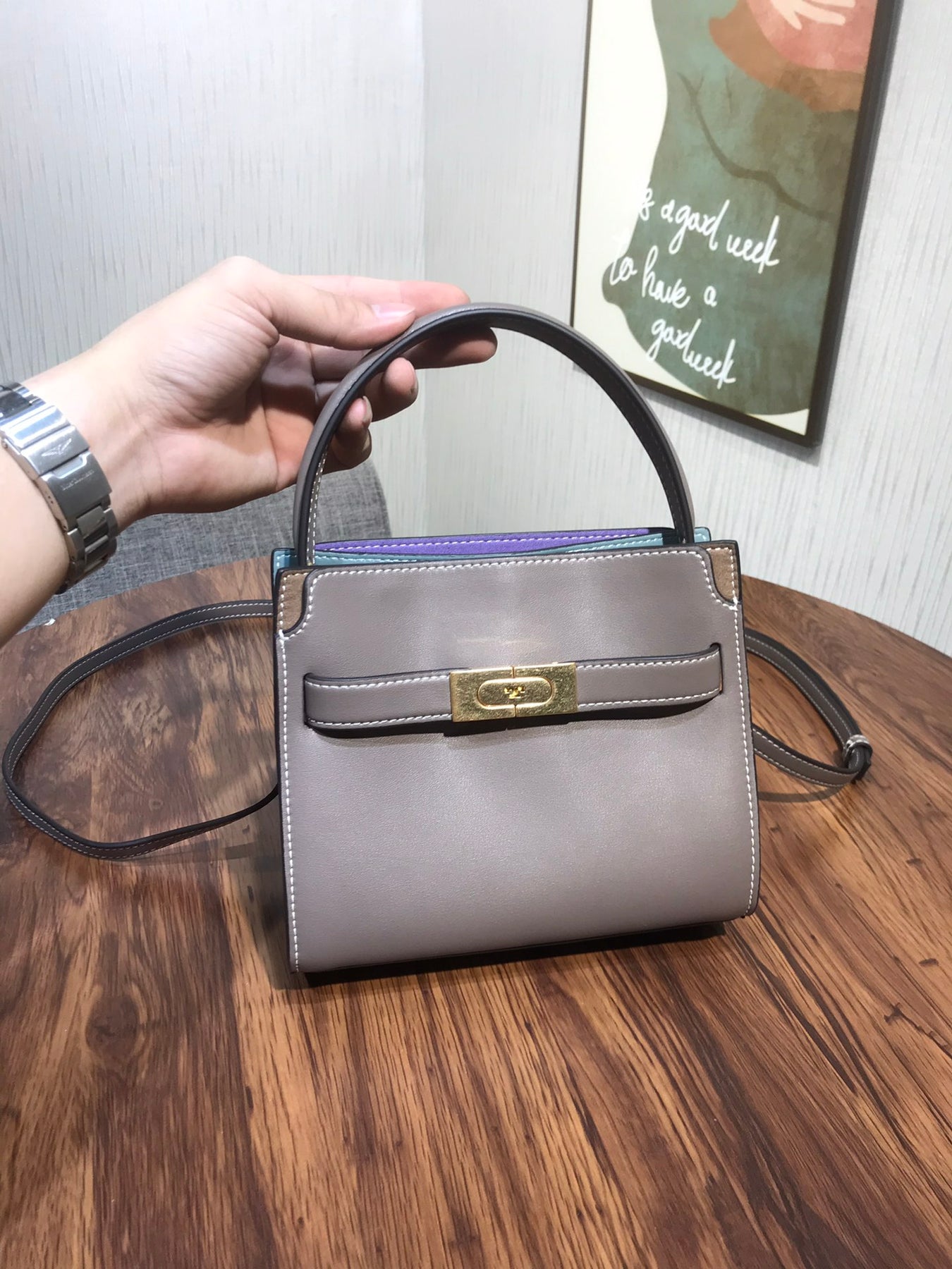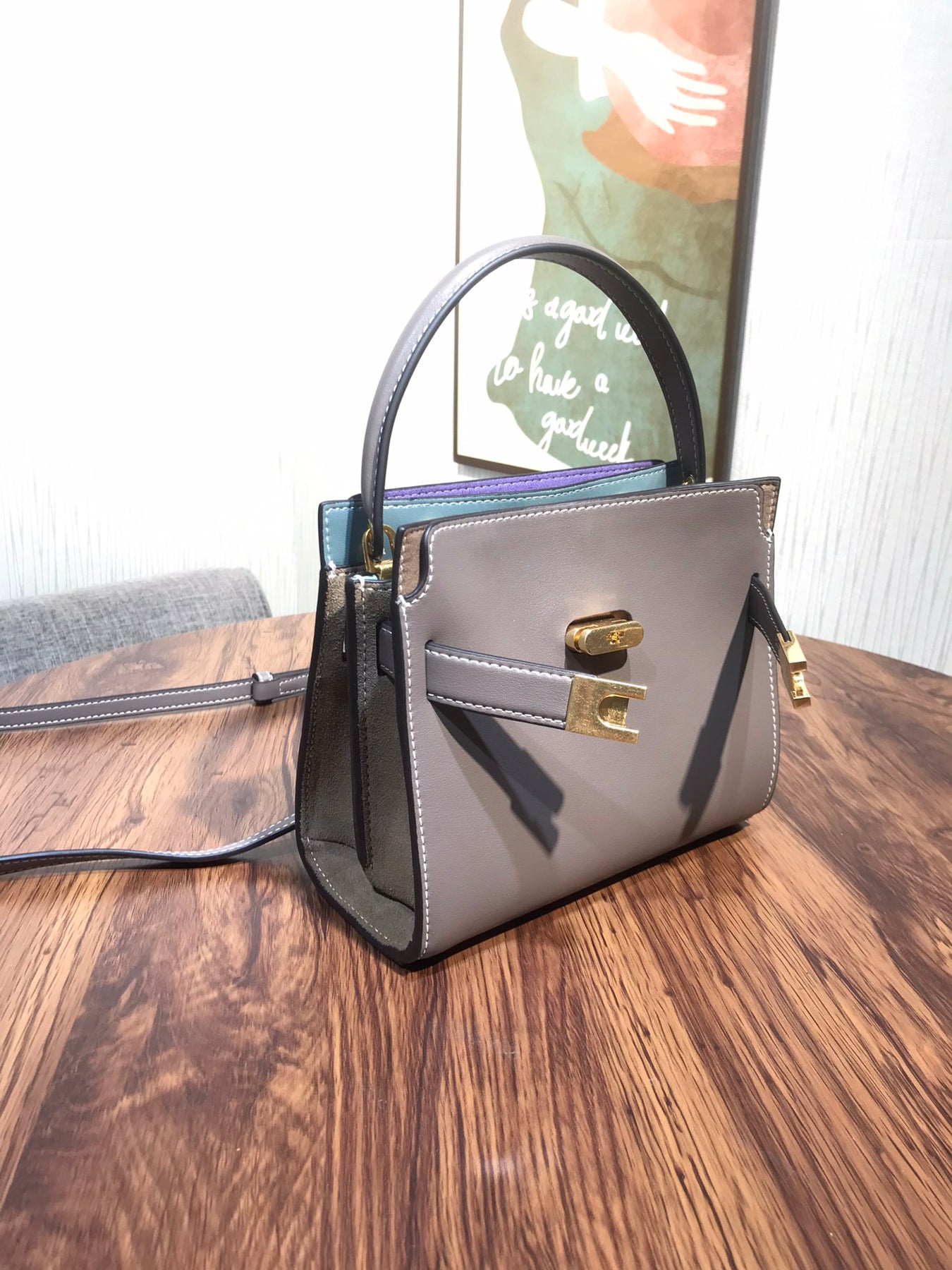 Introducing the Tory Burch Lee Radziwill Petite Double Bag in Grey - a charming mini bag that combines elegance with versatility. This exquisite accessory features a distinctive lock design and is crafted from mixed materials, showcasing a perfect blend of style and functionality. With dimensions of 19 x 16.5 x 8.5 cm, it's compact yet spacious enough to hold your essentials. Whether you're dressing up for a special occasion or keeping it casual, this mini bag complements any outfit effortlessly. Elevate your summer wardrobe with this quintessential piece from Tory Burch.