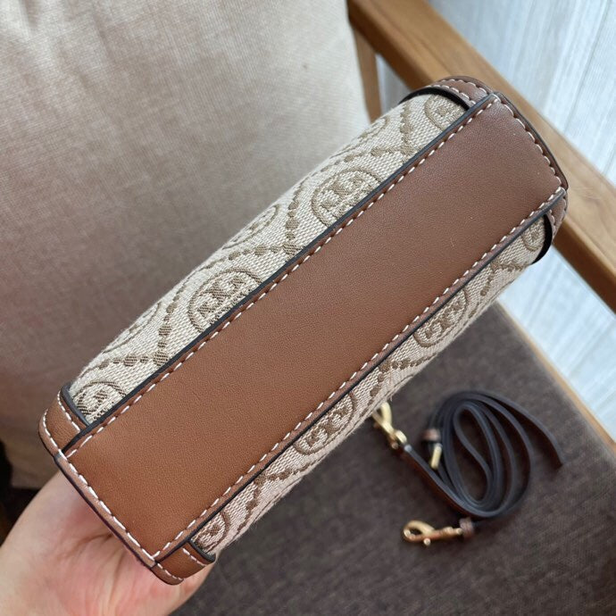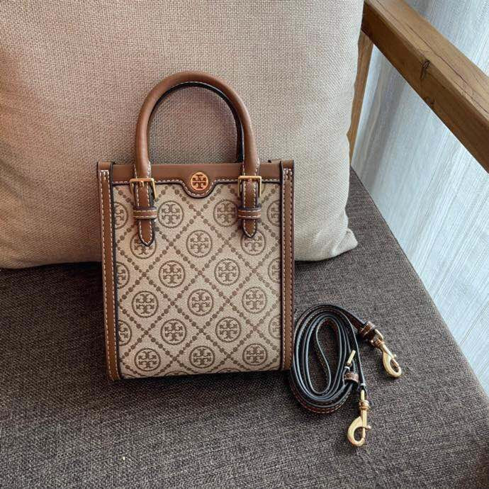 Introducing the Tory Burch T Monogram Jacquard Mini N/S Tote, a stunning addition to your autumn and winter wardrobe. This chic tote bag features a unique vertical retro style that seamlessly combines elegance with everyday practicality. Crafted with a stylish leather handle, it boasts a cleverly designed shape that enhances its aesthetic appeal.