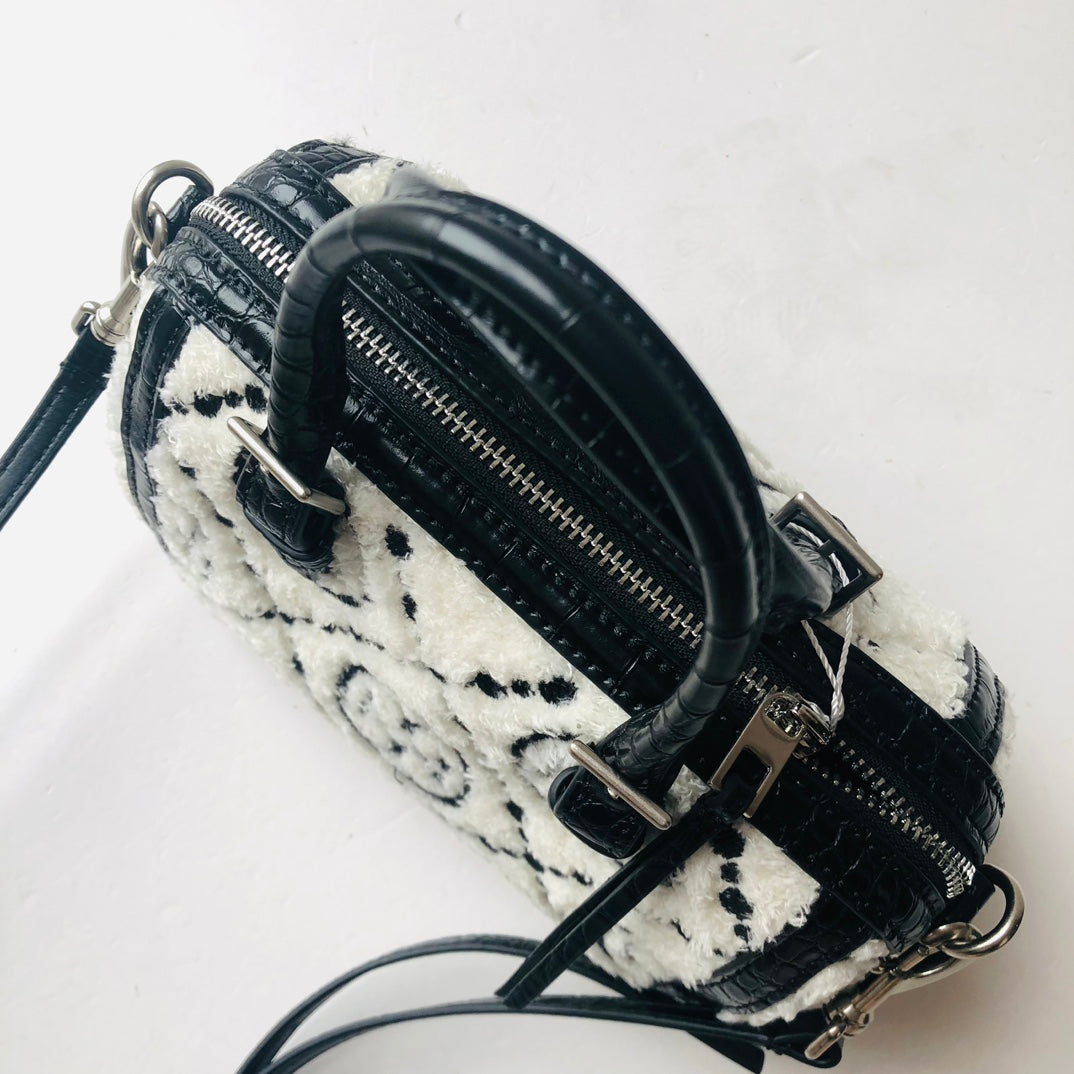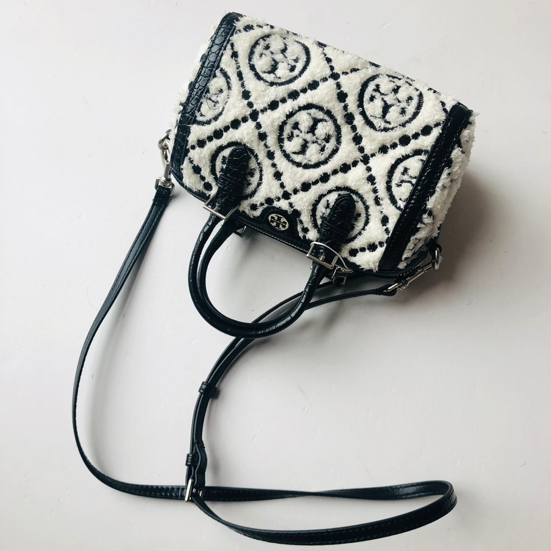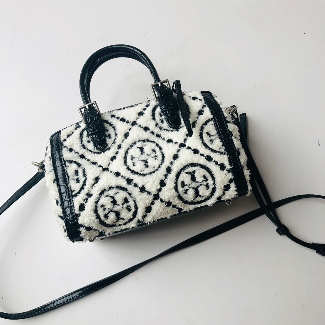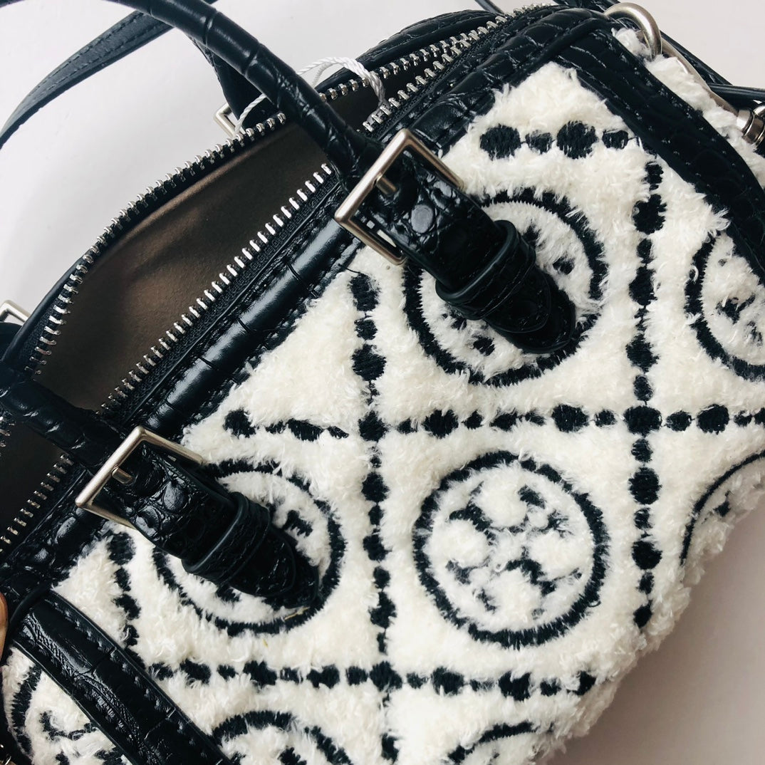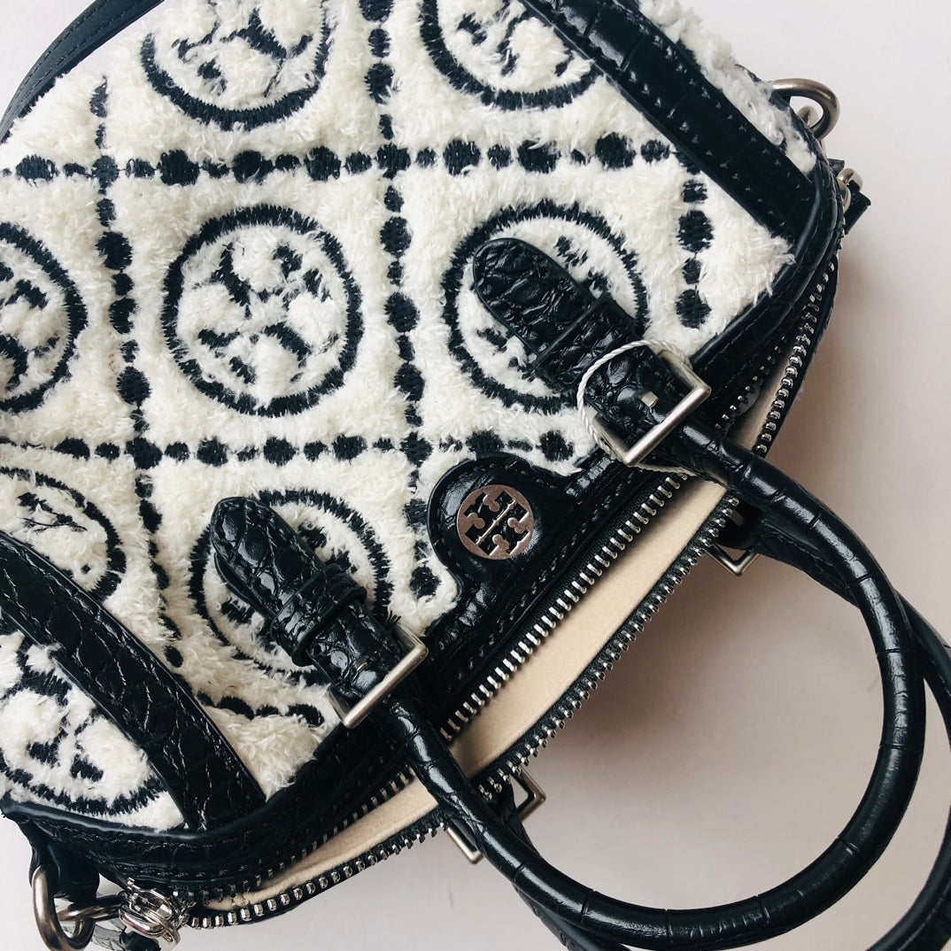 Introducing the TORY BURCH T Monogram Mini Jacquard Tonneau Bag, style number 1620. This stunning bag is the perfect accessory for autumn, effortlessly complementing your favorite sweater and coat. Crafted from premium woven jacquard fabric, this bag offers a timeless and unique aesthetic that stands out in any season.
