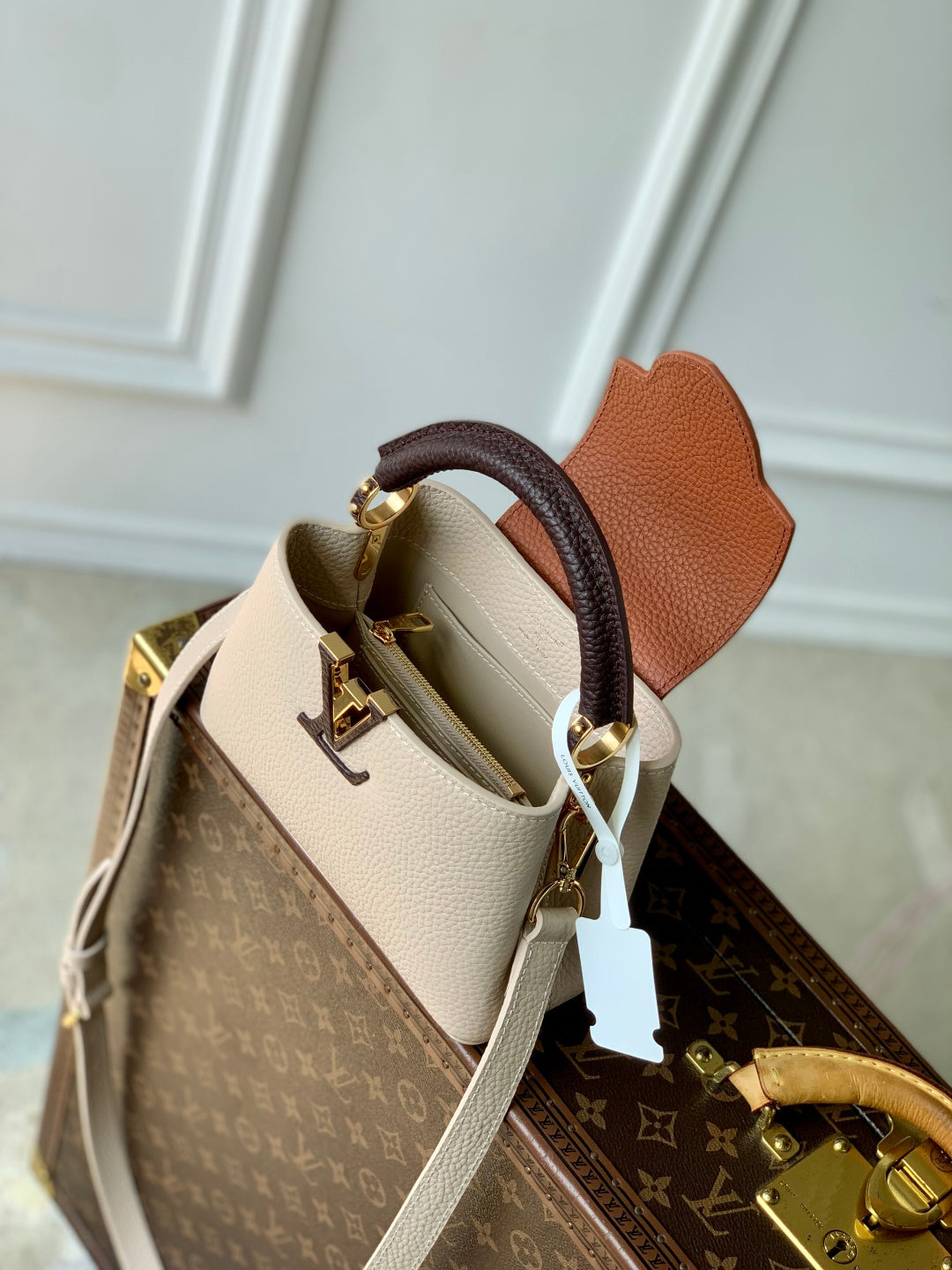 Elevate your accessory collection with the Tri-Color Capucines Mini. Crafted from luxurious Taurillon leather, this sophisticated crossbody bag features seasonal hues and elegant gold-tone hardware, showcasing the iconic LV monograms. With an organized interior that includes a secure zippered pocket for your valuables, this stylish bag is as functional as it is chic. The adjustable and removable shoulder strap allows for versatile wear. Dimensions: 13.6 × 8 × 21 cm (Height × Width × Length). Perfect for any occasion, the Capucines Mini is your go-to statement piece.